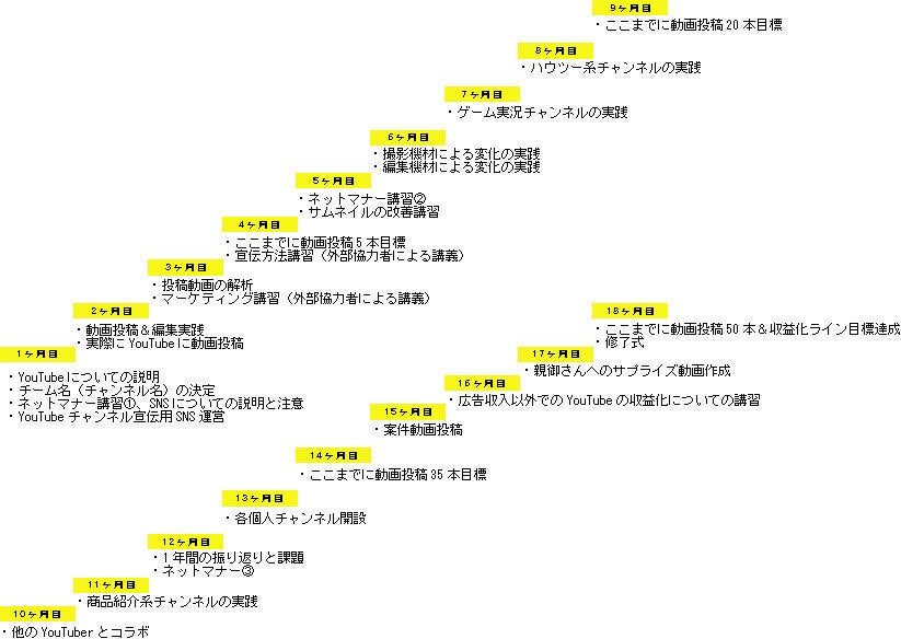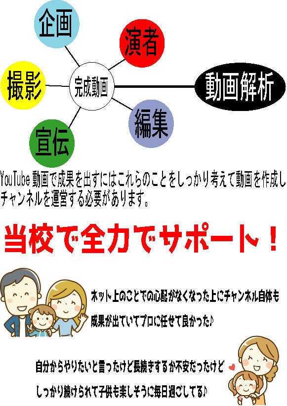 子供が安心してYouTube活動を行えるスクールを作り、YouTubeを通して行動力や発想力を身につけて欲しい。グループで1つのチャンネルを運営し目標は収益化ラインのクリアです。YouTuberになるのが目的ではなくチャンネル運営から自分が楽しいと思える事を見つけてもらえれば最高です。