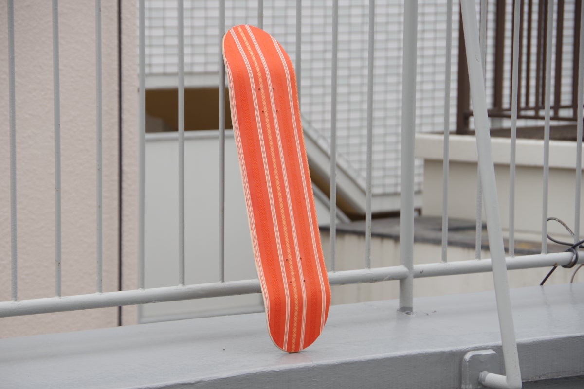 こちらはスケートボードのデッキテープ側に、博多織を特殊加工し貼り付けたスケートボードチェア。スツール、サイドテーブル、ディスプレイ用としても。