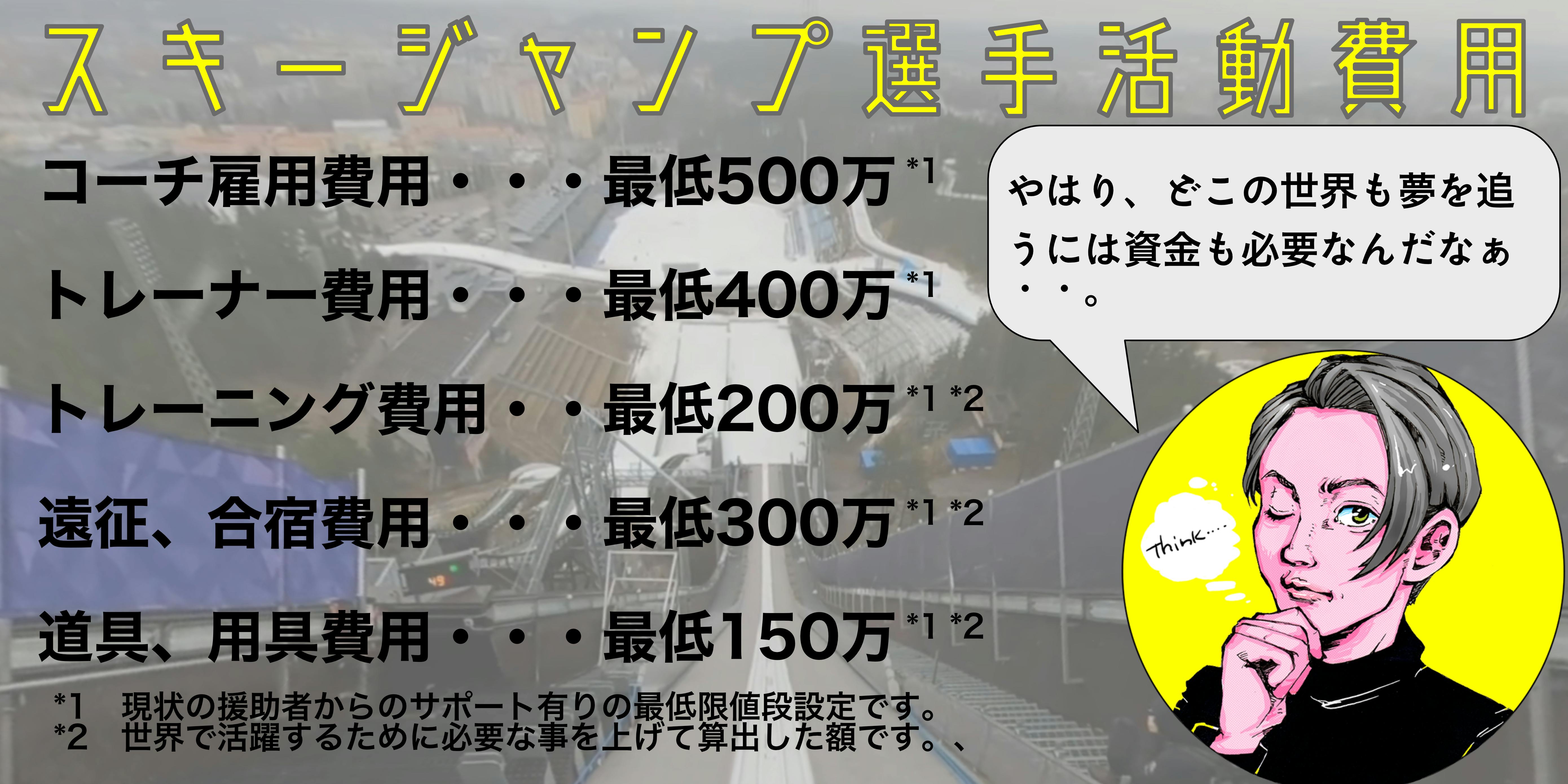 現状僕は企業スポンサーや前回のクラファンでの支援、長野県スキー連盟からの支援制度がある中で、昨年度はなんとかギリギリ自分1人の活動はできたものの、新人2人はバイトで生計をたててます。