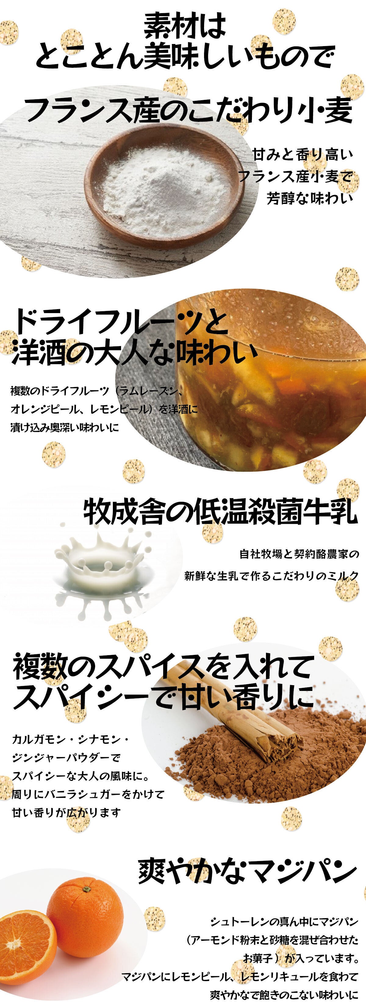 ③洋酒に漬け込んだ大人な味わい…洋酒に漬け込んだドライフルーツをたっぷり入れることで、シュトーレンも濃厚で大人な味わいに。