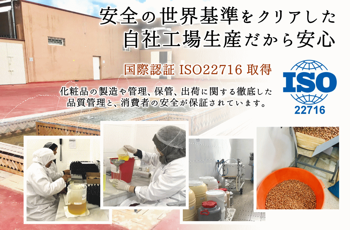 日本で流通する大半のアルガンオイルはモロッコのアルガンオイル組合から購入したオイルを使用しており、第三者の公的な基準の下での厳格な品質管理は行えないのが実情です。