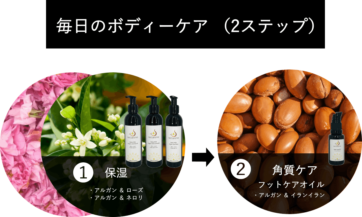 ネクタロームでは、最も等級の高い(最も採取用の少ない)方法で抽出したアルガンオイルのみをコスメに使用。またアルガンオイルに限らずオイルは酸化しやすい特性を持つため、イタリアで独自に開発した専用の遮光瓶を全製品に使用しています。