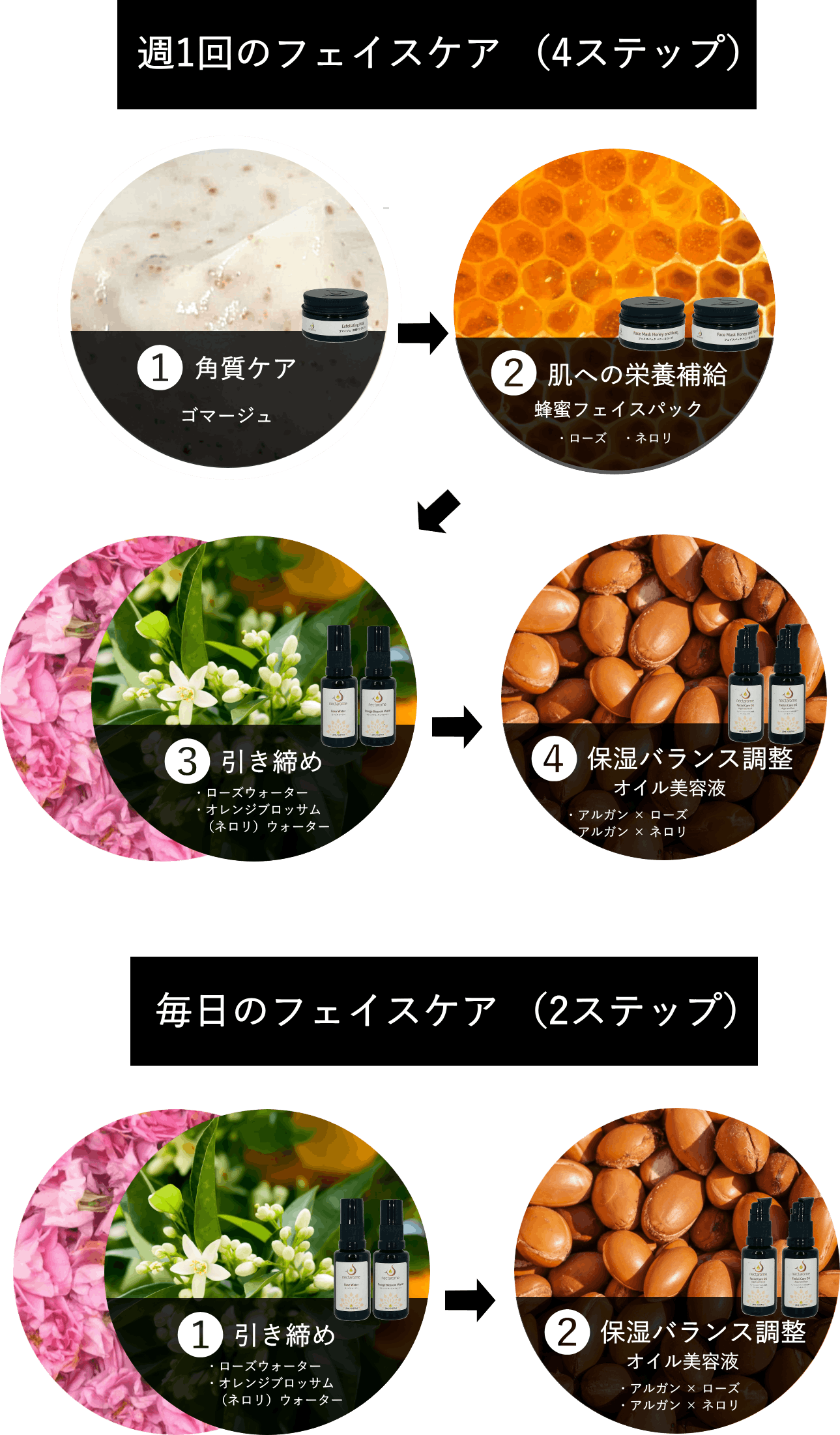 ゴマージュ(角質ケアミルク)・フェイスパックは、週1回の使用をおすすめしています。化粧水とオイル美容液は、朝の洗顔後に1回、夜のシャワーまたは入浴後に1回ご使用下さい。