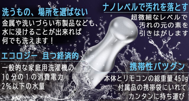 ハイパワーの1秒間に 36,000回 × 100W の超音波が水の中で作り出すナノレベルの微細な泡でこれまで従来の、水の勢いで洗う、擦る、圧力で汚れを落とす、とは全く別の洗浄方式を備えた「モバイル型 洗濯ツール」です。