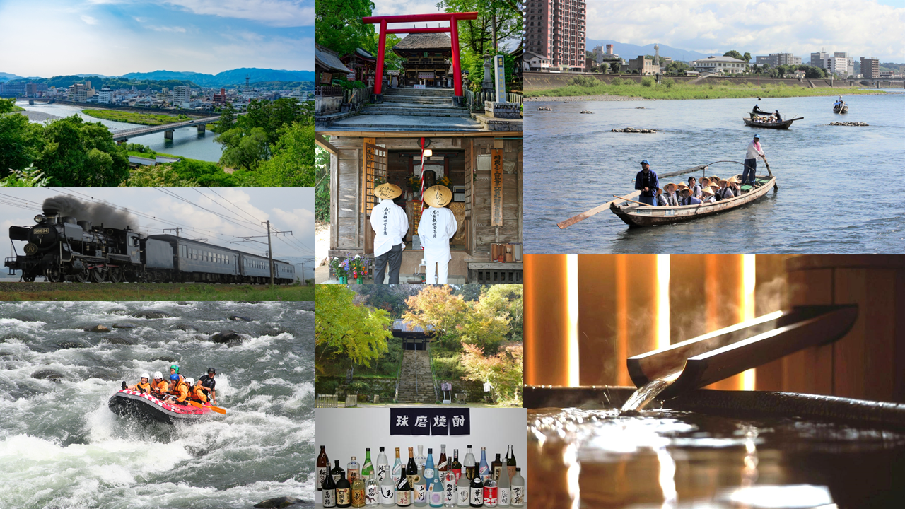 また、「柔らかいお湯(美人の湯)のでる温泉地」でもあり、露天風呂から大衆浴場など温泉巡りも楽しめるほど、温泉も豊富にあります。さらに、熊本県唯一の国宝「青井阿蘇神社」、「球磨川下り」や「ラフティング」・「JR肥薩線のSL人吉号」「球磨焼酎蔵めぐり」など、ふんだんな見どころのある街です。