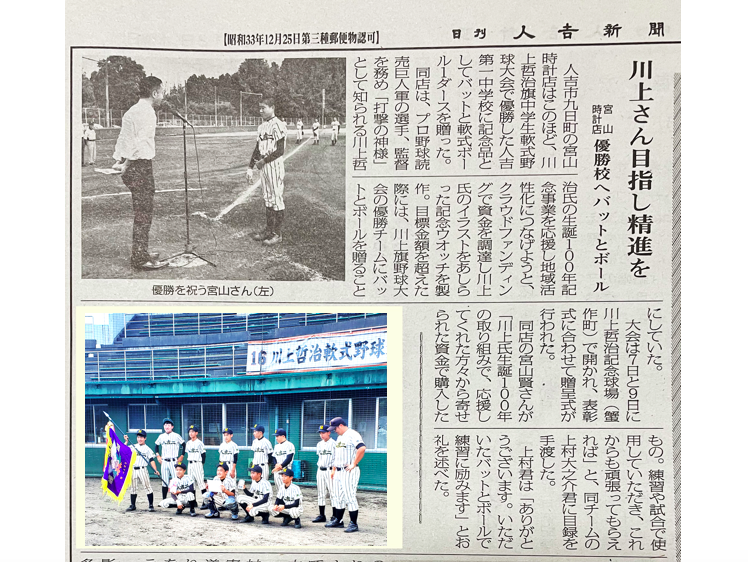 そんな中でも、時計店を受け継いだ以上、何としてでも人吉の賑わいを取り戻す努力を続けていかないといけません。先代の思い、先々代の思いも私の肩にかかった今、100年以上続く人吉の時計屋として何かできることはあるのか・・・と思っていた時、「2020年が川上さんの生誕100周年にあたるんだって」という話を聞きました。実は、野球は、私の人生において「中畑清さんの引退試合で逆転満塁ホームラン」を打ったところで燃え尽きており、川上哲治さんや川上記念球場のことを知ってはいましたが詳しいことは知りませんでした。私の中で「終わっていた野球」でしたが、息子たちの小中高時代、野球の試合で一喜一憂していたことから川上記念球場にはとてもいい思い出があります。