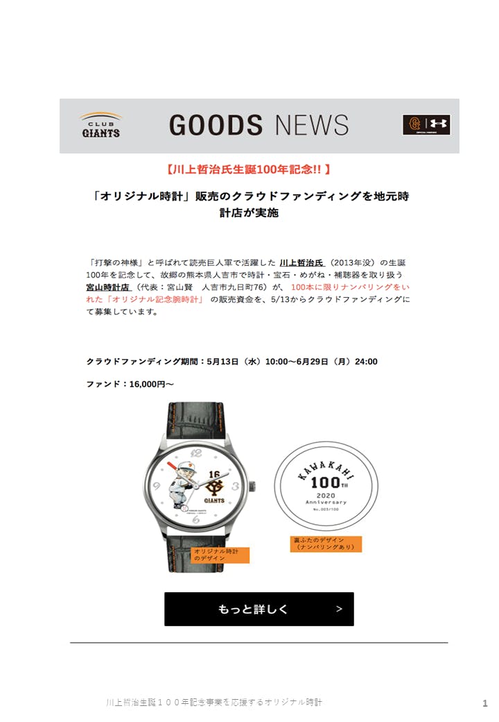 「川上哲治生誕100周年記念オリジナルウォッチ作成プロジェクト」を立ち上げました。