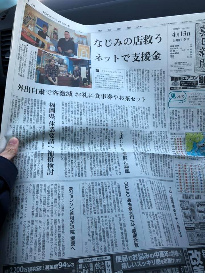 2020/04/14 12:00朝日新聞に、掲載されました・・・なんと夕刊1面!!紙面には「応援メッセージが相次ぎ、、」としっかり皆さんのコメントの事も取り上げていただきました。改めて、このプロジェクトは私たちだけの力でなく、リターンを入れてくださったお一人おひとりの力によって、小さな力が集まってこのような大きな金額という形にできたのだと感じております。本当にありがとう、、ありがとうございます、、!!微力は無力じゃない。世界は思いやりに溢れています。新たな繋がりもできました。困った時に支えてくれる「人と人との繋がり」、まさに生きたセーフティネットです。(プロジェクトの「支援者」のタブから全てのコメントを読むことができます)クラウドファンディングが終了しても、この皆さんからの応援を糧に頑張ります!新聞紙面に掲載された事で、全国どこの飲食店、どの業種も厳しい中、自分の事業を守るために「クラウドファンディング」という手段を選ぶキッカケになればと思います。頑張れ全国の事業者たち!HAPPYHILLからは、このクラウドファンディングに関して最後のお願いです。ラスト10時間、「もう1シェア」のご協力をぜひお願いします。#コロナに負けるな#頑張れ福岡の飲食店Twitter: @HAPPYHILL18Facebook:https://www.facebook.com/655156981237316/posts/2806452922774367/?d=nInstagram: https://instagram.com/cafe_happyhill?igshid=g2ha4gavkmuf もっと見る