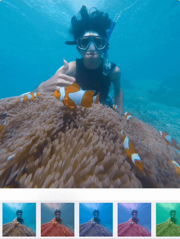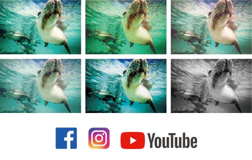 19つの画像フィルターと簡単なビデオ編集で視覚効果をカスタマイズしてFacebook、Instagramで映像や写真をすぐに簡単に共有できます。さらに、DORYは水面下でYouTubeおよびFacebookにライブ配信できます。もちろん動画の録画、写真の撮影も可能です。