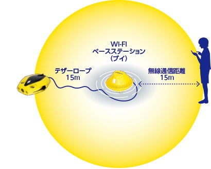 ベースステーションとなるブイと本体のテザーロープで、垂直/水平の操作半径は15m。さらに、ブイと操縦者の無線通信距離15mで、操縦半径は2倍に。