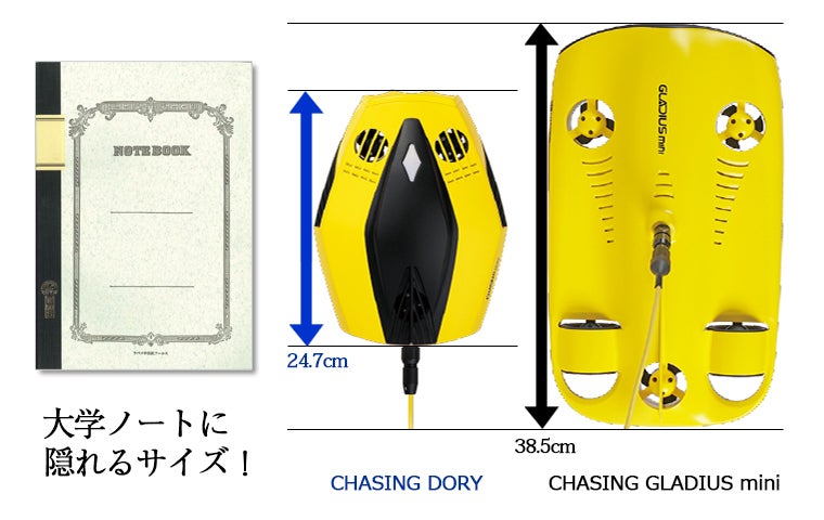 そこで、最近ではテレビ番組の水中撮影など、本格的な撮影でも使われるようになっている、DORYのお兄さん(?)GLADIUS miniと大きさを比べてみました!最近は本格的な撮影をする機体でもとてもコンパクトになってきていますが、それよりさらに小さいのがDORYです。