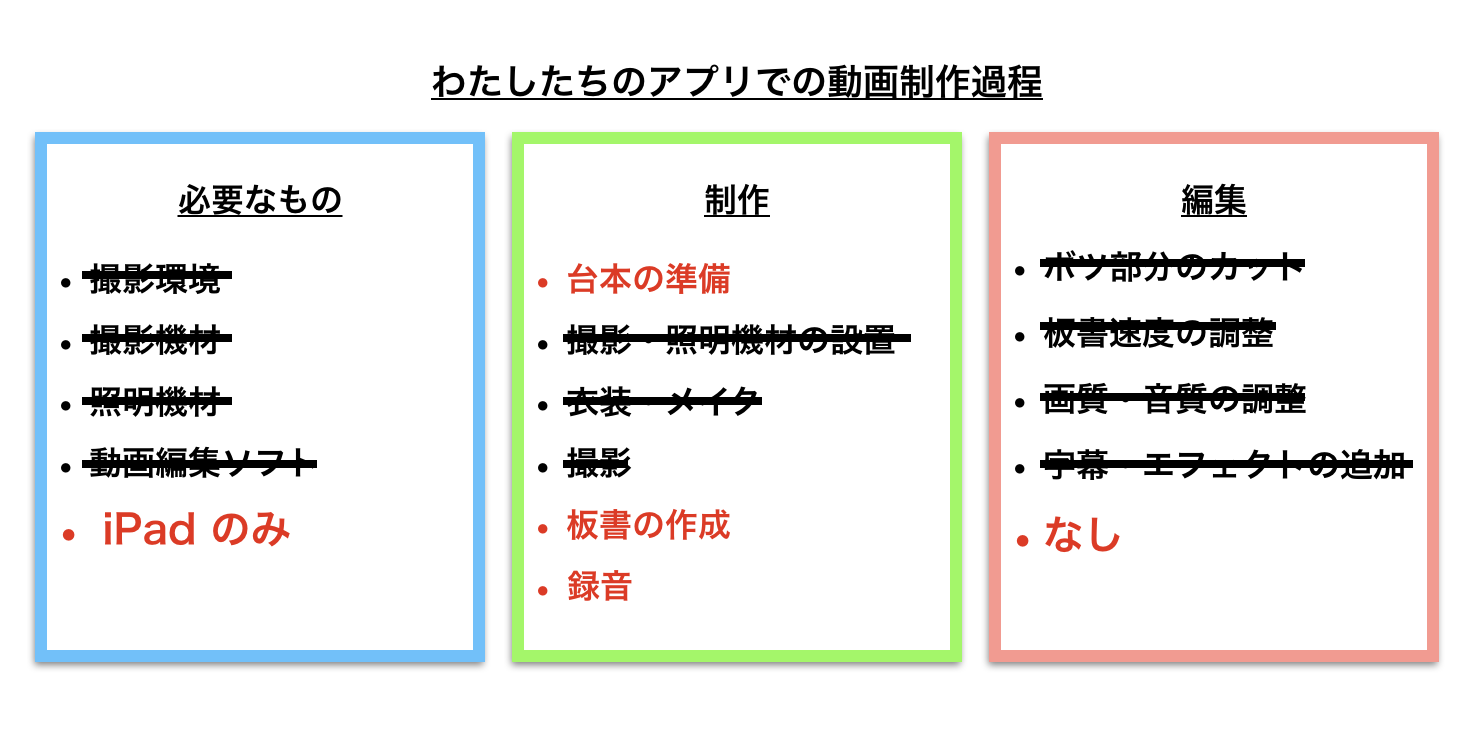 私たちは 板書+ナレーション形式 に特化して、見やすくてテンポのいい動画を 必要最小限のコスト で制作できる iPad アプリ の開発を進めています。