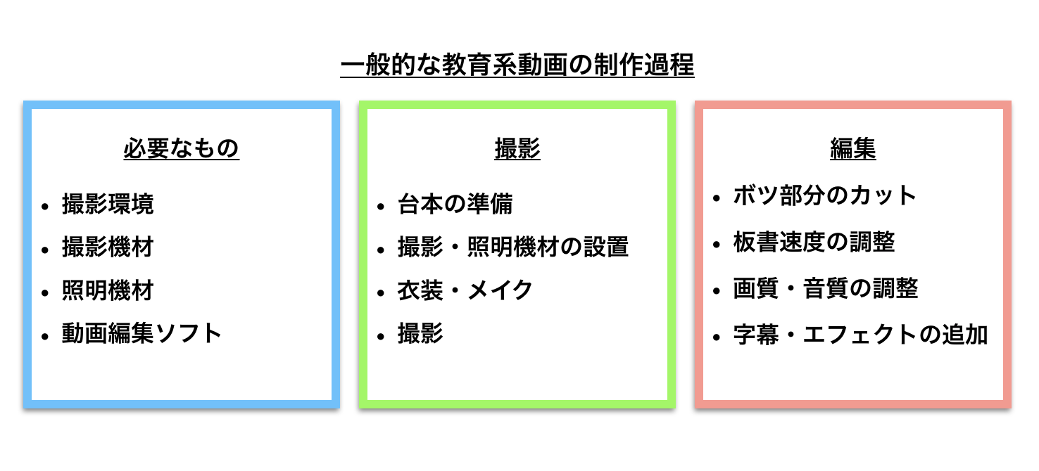 授業形式の教育系動画を制作するには、 機材の準備・撮影・編集 とそれぞれ 大変なコスト がかかります。教育系 YouTuber に関心を寄せている人でも、これらの壁を越えることのできる人は限られます。