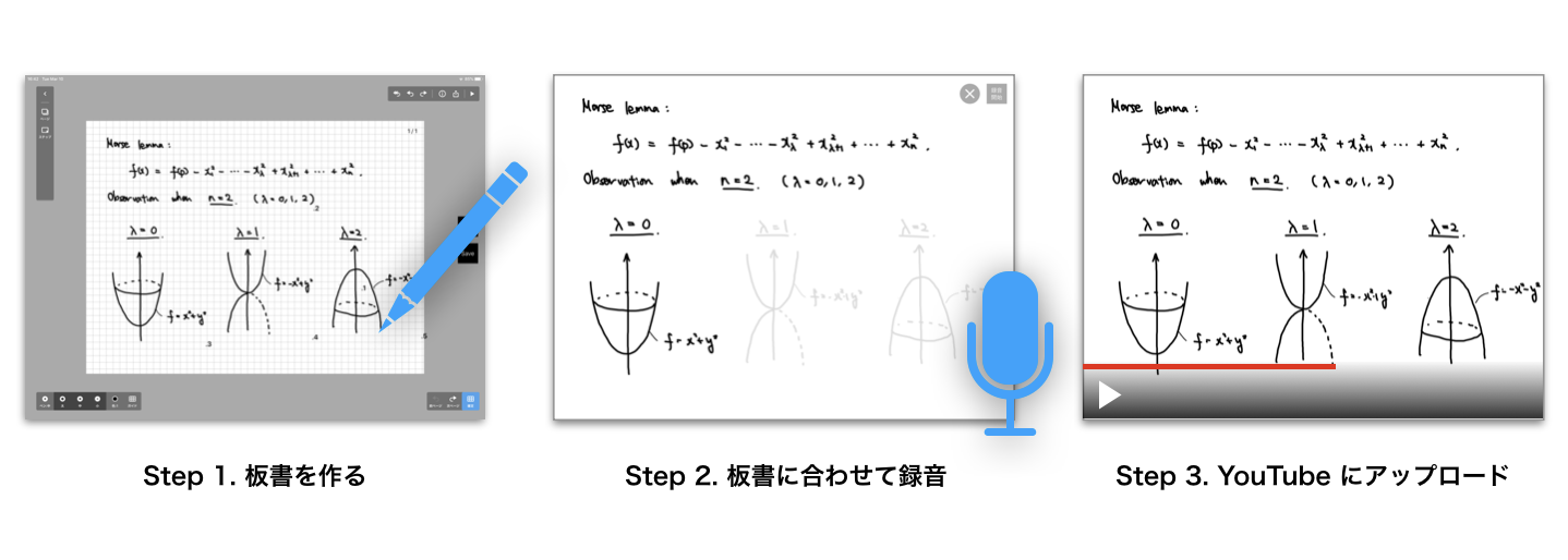 文字を書くスピードは話すスピードよりも遅いため、筆跡をそのまま再生すると板書待ちのもたつき が発生します。このアプリでは、板書時に記録した筆跡が、録音時には 高速化して再生 されるため、テンポの良い解説動画を 編集なし で作ることができます(上のデモ動画をご覧下さい)。