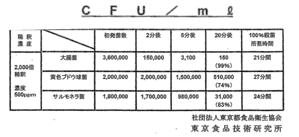 下図は当社のシェール温泉を用いたプール実験の結果です。2000倍希釈時における大腸菌などの一般生菌の殺菌データを時系列で示していますが、概ね30分以内に100%殺菌が達成しました。