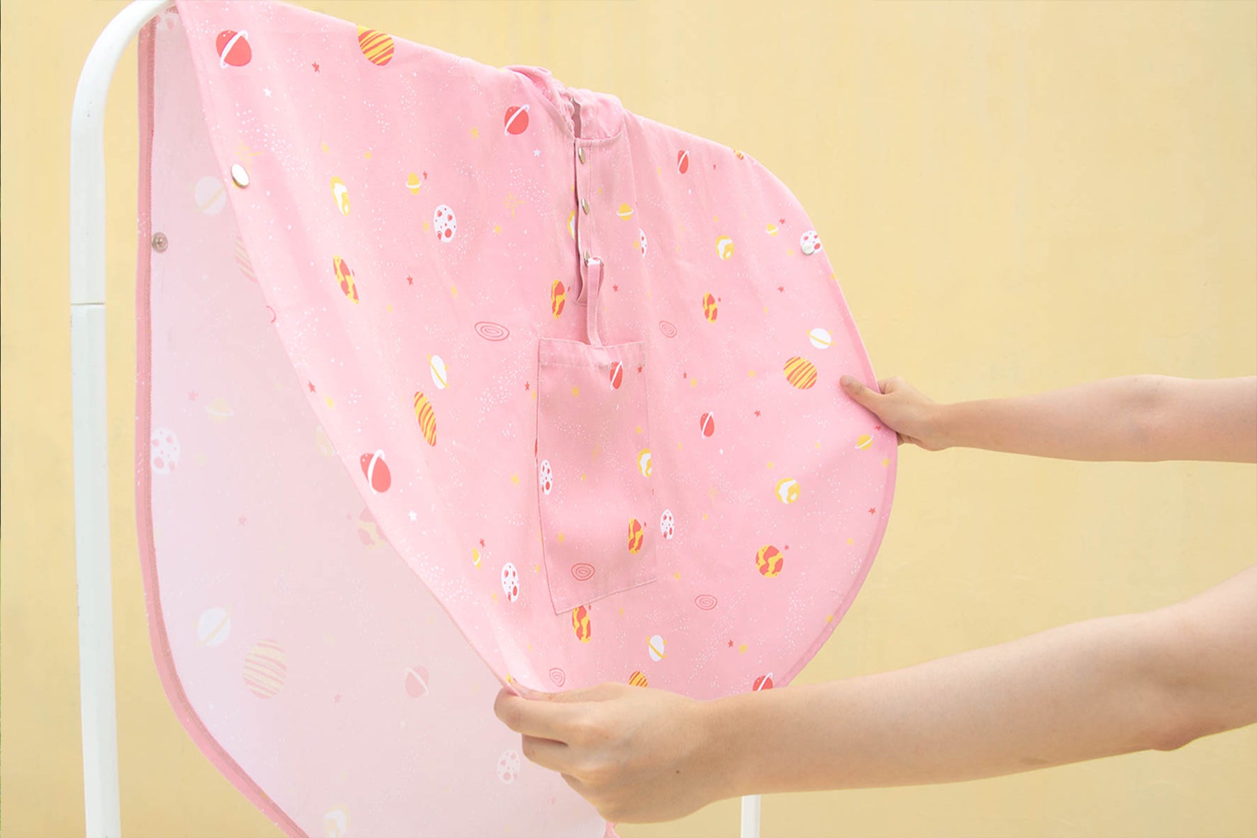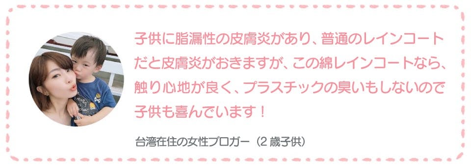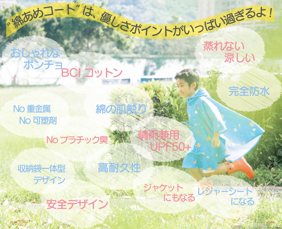 本商品は、日本ともなじみの深い台湾でつくられる商品です。台湾のデザイナーが設計して、台湾のおばさんが編む、この国の優しさと人の温かさで作ります。一般的なレインコートは、蒸れて匂いも臭いだけでなく、さらに破れやすいので、すぐにプラスチックゴミになってしまいます。でも「綿あめコート」なら、生産時にプラスチックの使用を80%も減らし、長く着られます。子供を安全と快適さで包むだけでなく、地球にも優しくなれます。原材料の生地をただ変えるだけで、あなたの生活習慣を変えずとも、環境を守ることに貢献できるのです。私たちの子供と、子供の未来のために、一緒に進んでください。