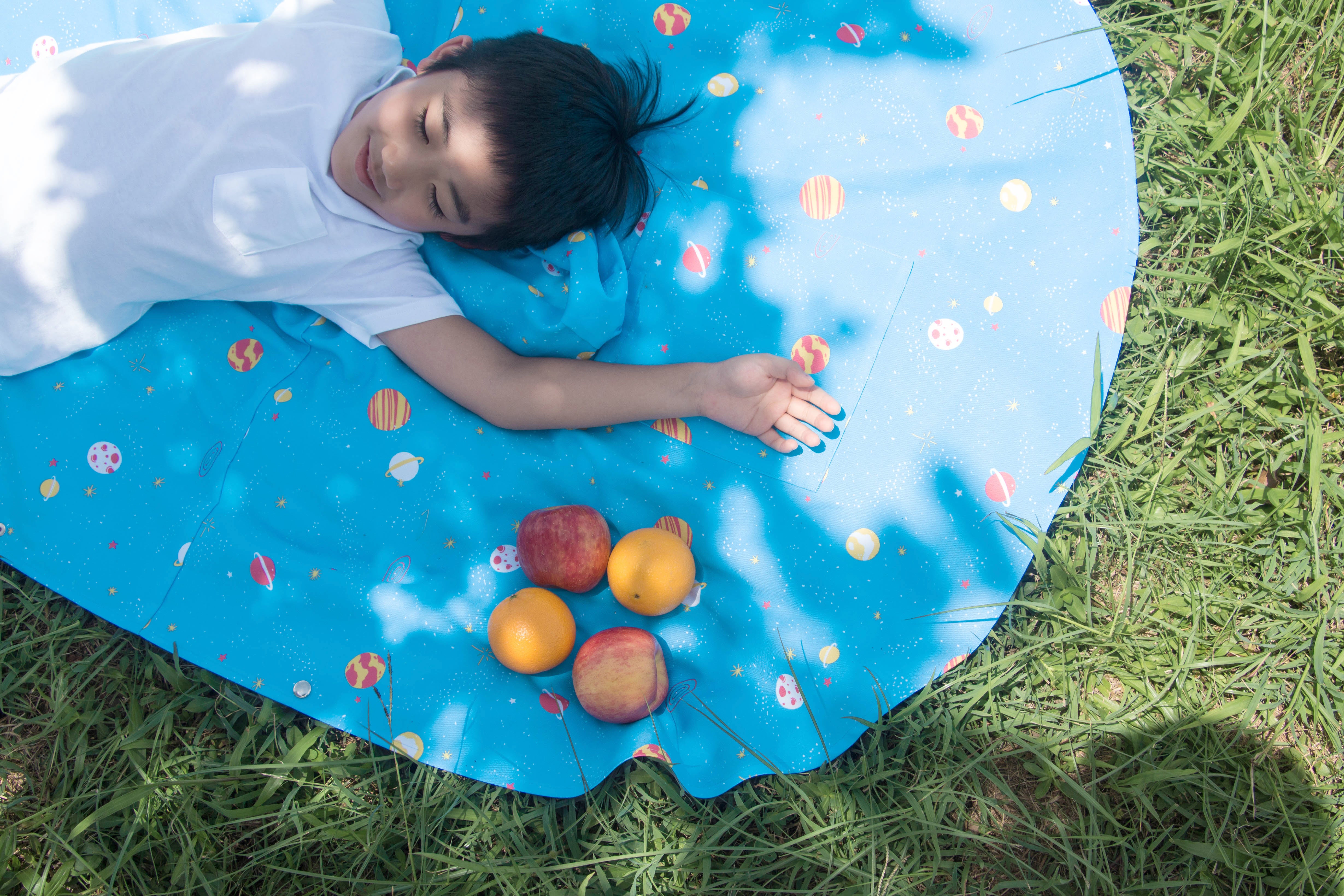 草の上で寝ころびたいときは、綿あめコート広げてください。気持ちのいいレジャーシートに早変わり。晴れの日も使えるよ!