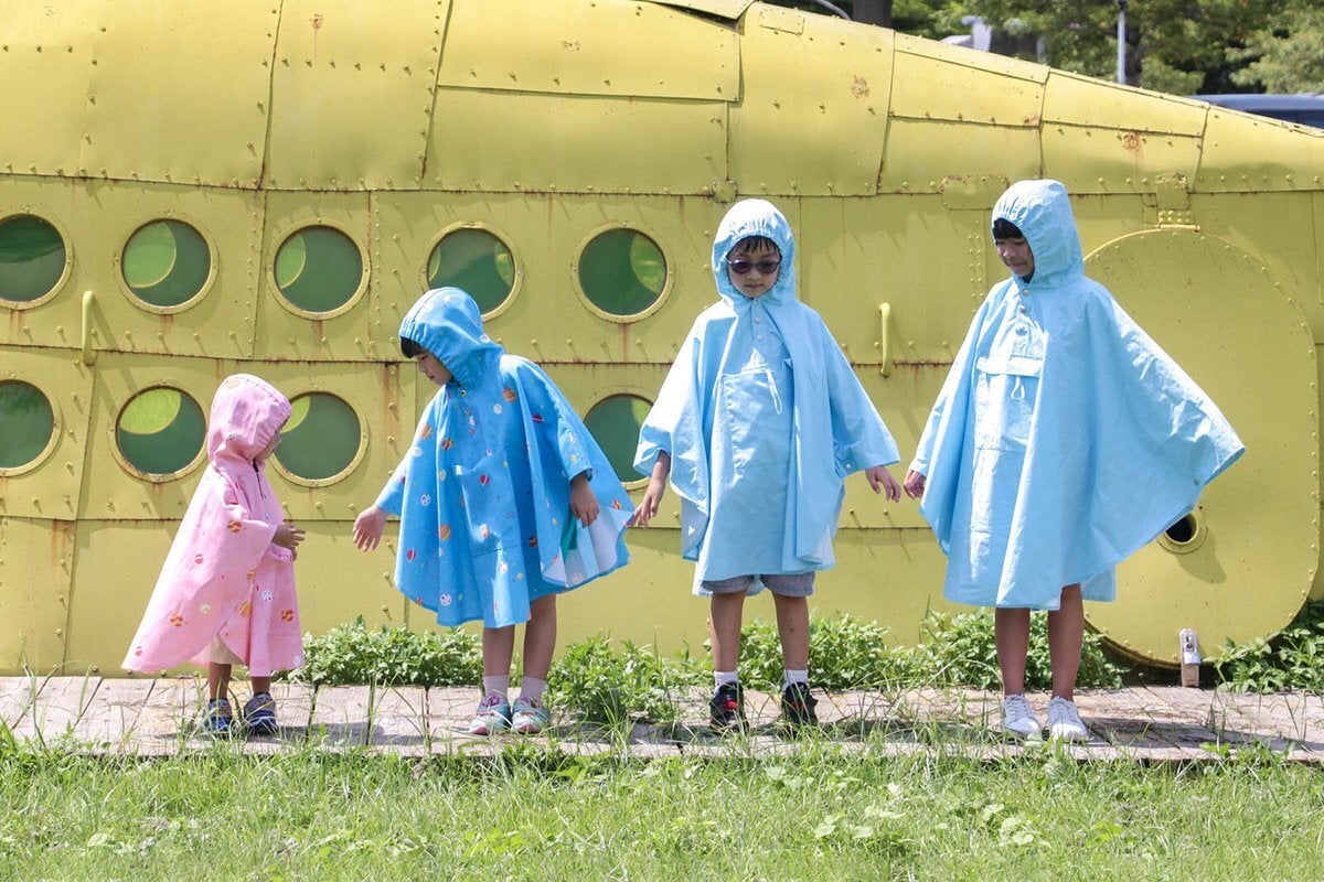 綿あめコートでは、市販の子供用レインコートではあまり見られない網目ラインの防水加工を施しており、完全防水を実現しています。