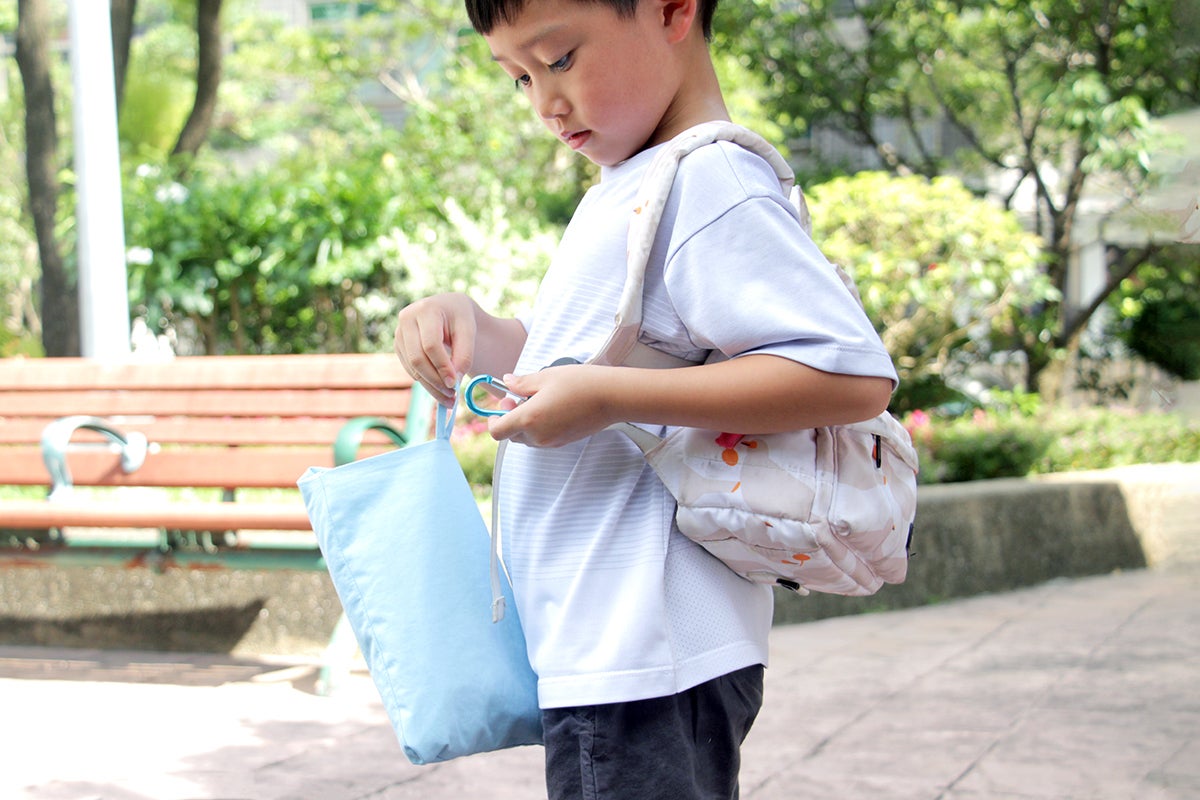 収納袋にフックがついていて、ランドセル、教室の机、玄関のフックにかけられるね!