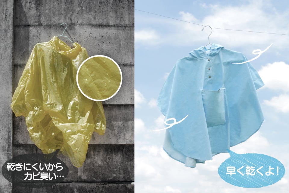 プラスチックを使ったレインコートが臭くなるのは、プラスチック生地での水分の蒸発が遅いからです。いったん着ると皺ができやすく、そこに菌が繁殖しやすくなります。「綿あめコート」なら、広げると1枚の平たい布になり、日差しから隠れる部分もないので、すぐ乾き、カビ臭さはありません!