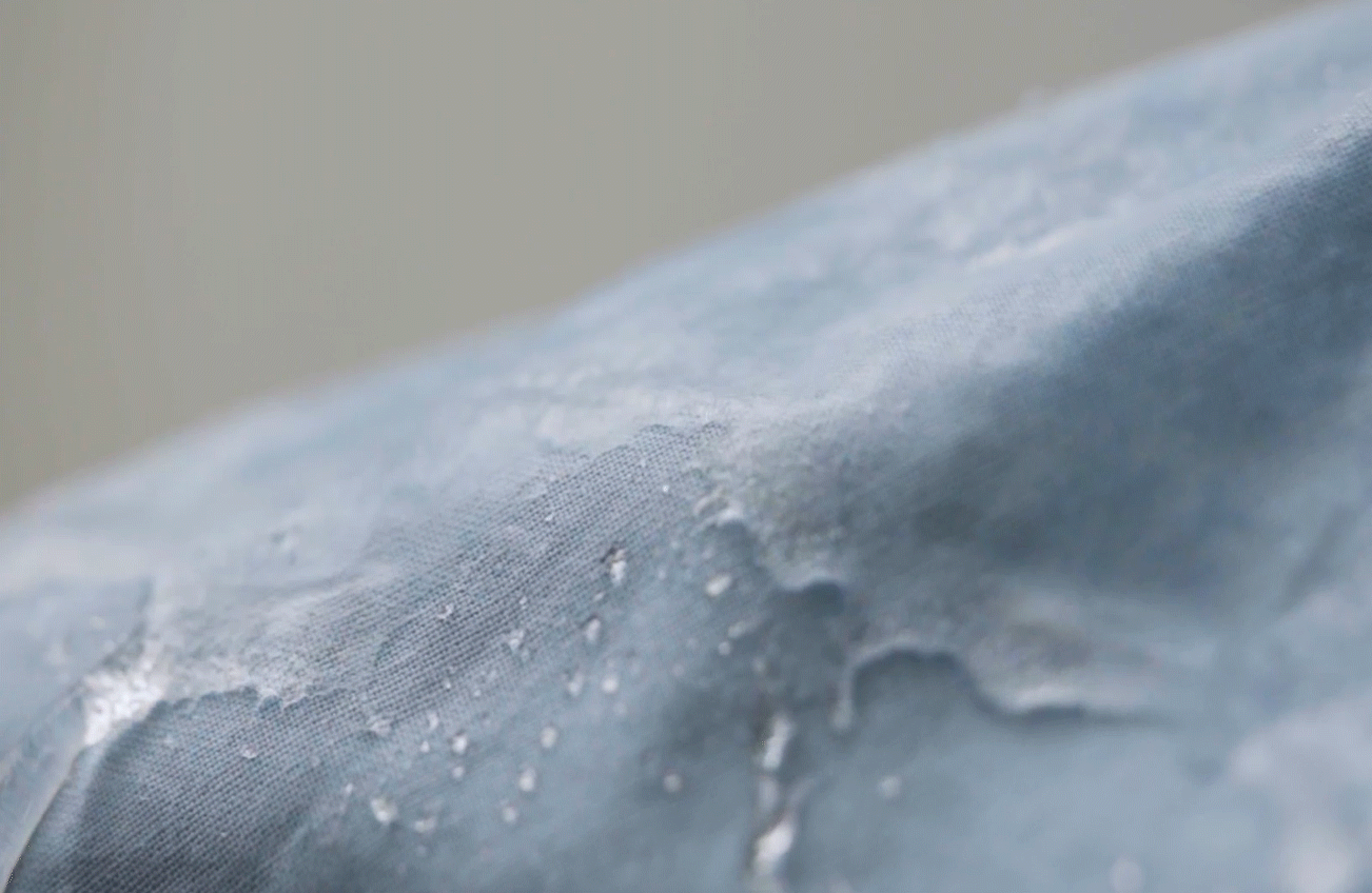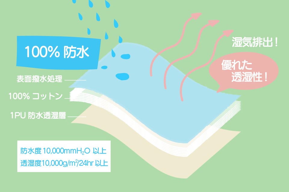 防水かつ透湿性。この相反するベネフイットを実現しました。 100%綿コットンの主層の両サイドに特別な加工を施し、外層には撥水加工を、裏にはPUで防水透湿加工をいたしました。防水力はなんと10,000mmH₂O、消防に使う水の勢いにも負けない防水力。大雨でも大丈夫。