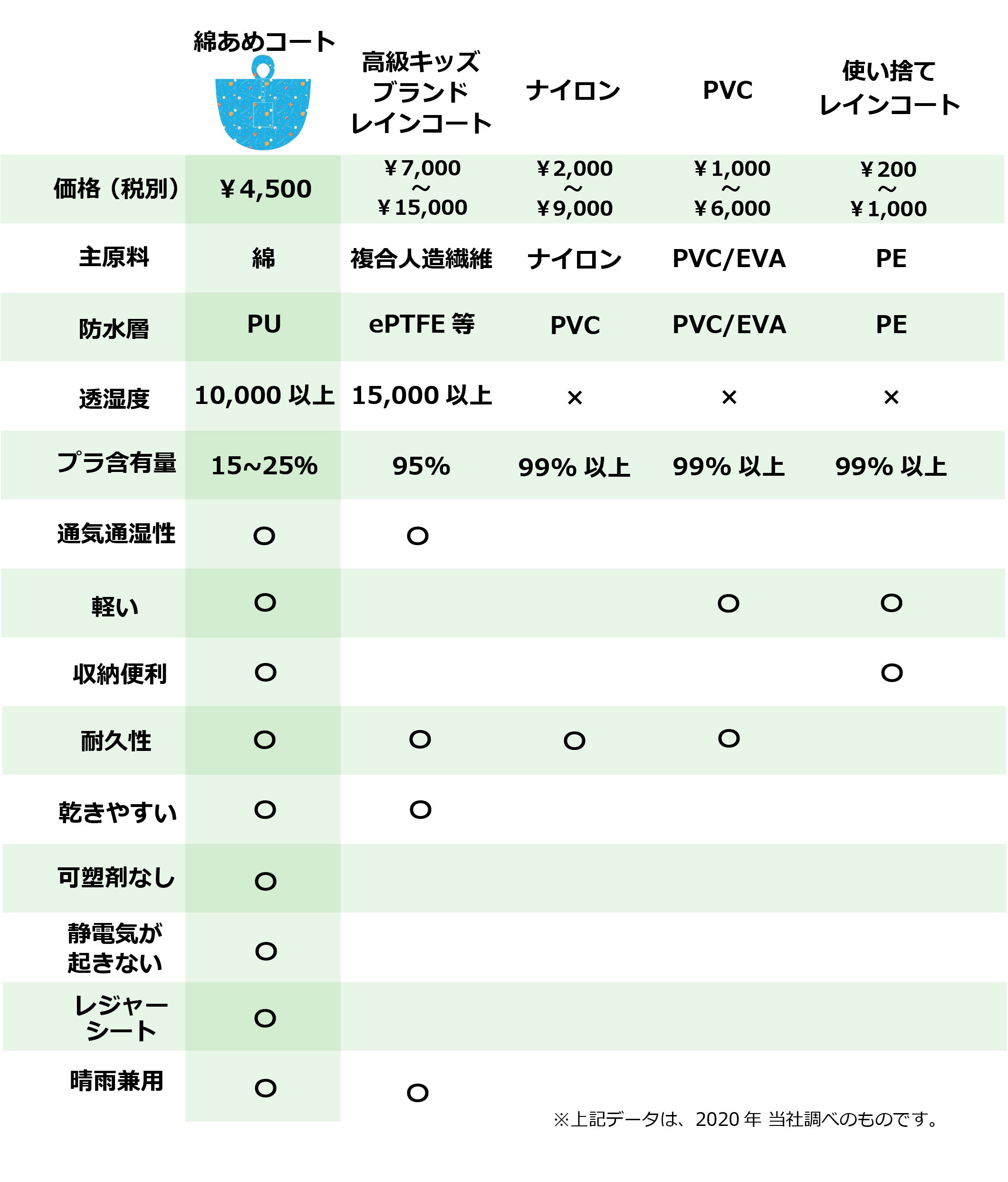 綿あめコートと一般的なレインコートとのスペックを比較しました。