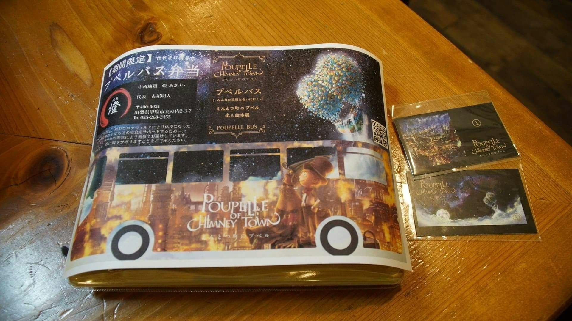※中身は唐揚げ弁当ですが、包装紙をプペルバスのデザインにします☆さらに、子ども達が毎日楽しめるおまけとして、絵本の1ページ(絵と物語)を載せたオリジナルのえんとつ町のプペルカード(全41種)を日替わりで配布します☆