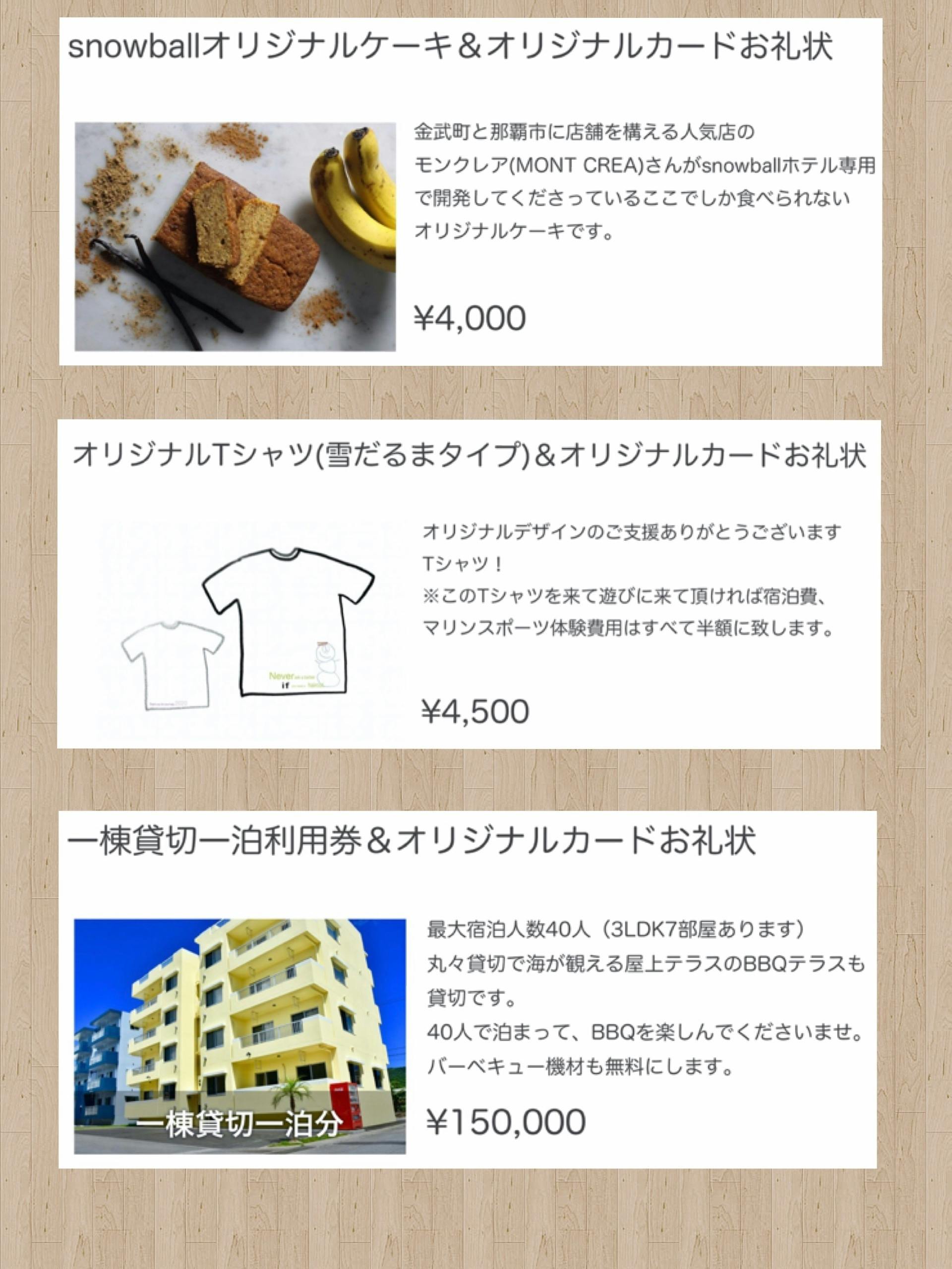 2020/05/01 13:55みなさまご支援,ご協力ありがとうございます。ご要望がありましたので,上記3点を追加致しました。①snowballオリジナルケーキエクレア日本一の有名店。MONT CREA さんのsnowballオリジナルケーキ。新しくオープンした那覇店は行列ができるほど人気です。②オリジナルTシャツ是非このTシャツを着てsnowballに遊びにきてください(*^^*)③一棟貸切一泊利用券ご家族,ご友人同士,社員旅行など様々なご旅行でお越し下さい(o^^o)引き続きよろしくお願いします。 もっと見る
