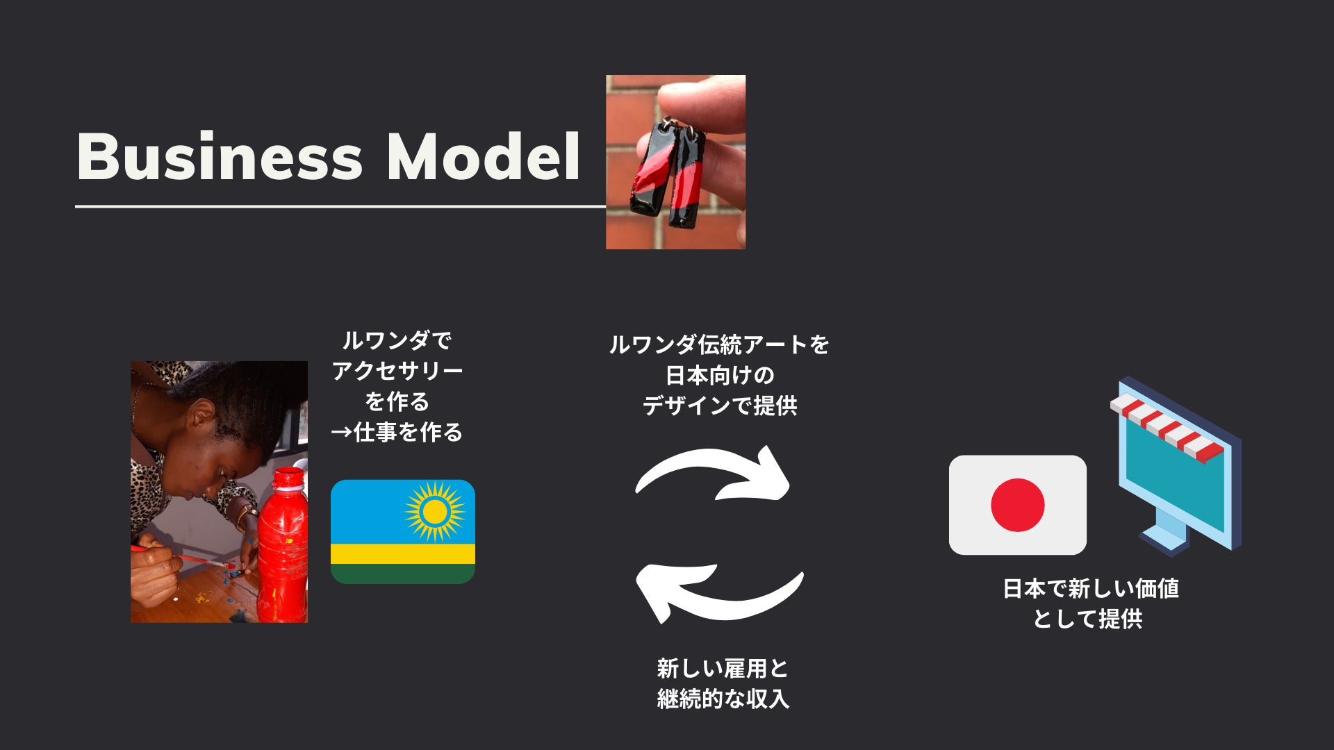 具体的には、ルワンダで製作される伝統アート「イミゴンゴ」を利用したアクセサリーを作って、それを販売します。この仕事を母親達がすることで、子供達が自ら将来を切り開ける体制を作りたいと思っています。