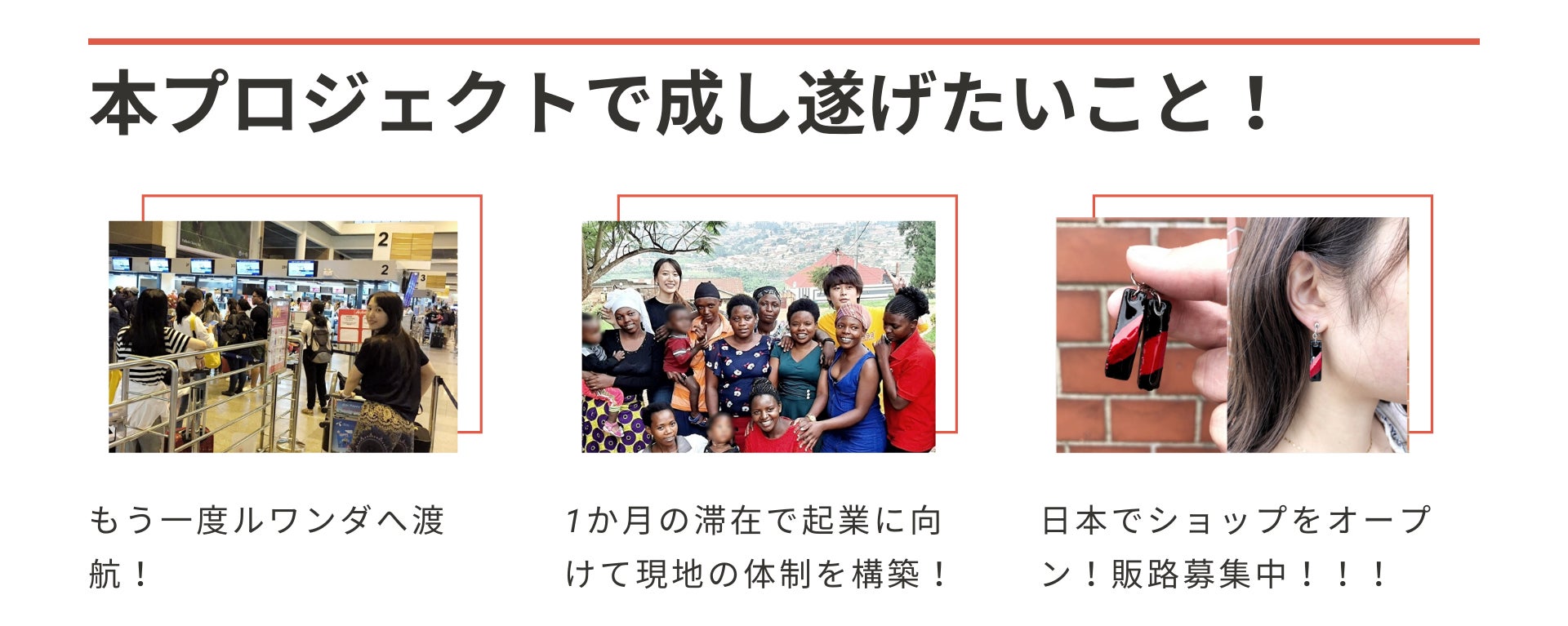 2022/07/07 07:35いつも応援してくださる皆様へお世話になっております、プロジェクトオーナーのかりんです!ご支援いただいている皆様にご報告が遅れていること、大変申し訳ございません。------------------------------------------------「高校生がアフリカ貧困層の子供を救う!伝統工芸をRe:Designして新たな価値へ」<現状報告>新型コロナウイルスの世界的流行のため、当初予定していた2020年8月の渡航を2023年3月(予定)に延期する判断を致しました。この活動を少しでも早くスタートさせ、現地のシングルマザーの皆様、その子供たちに還元したいという想い、この活動を応援していただいていた皆様にいち早くリターンをお届けしたい想いがあったため、苦渋の決断ですが、今回の判断をしました。また、ネクストゴールに指定させていただいたポップアップストアのオープンの日時も、ルワンダ渡航後である2023年4月以降に変更させていただきます。渡航日変更に伴い、リターンのお届け時期を以下のように変更させていただきます。・イミゴンゴ手作りアクセサリー(卸売販売プランを含む): 2020年9月(当初) → 2023年4月(変更後)ピアスは現地に工房を作り、現地の方々が製作しているということが重要だと考えているので、2023年の渡航時に工房を作り、そこで完成したものをお届けします。・アンテナショップコーヒー1杯引換券: 2020年9月(当初) → 2023年4月(変更後)渡航延期に伴い、ポップアップストアオープンの日時を2023年4月以降に変更させていただくため、こちらの納期とさせていただきます。・現地の子供からの感謝のポストカード: 2020年9月(当初) → 2023年4月(変更後)2023年に渡航した際に現地で子供の写真を撮影し、ポストカードを作成するため、こちらの納期とさせていただきます。・イミゴンゴ写真集: 2020年9月(当初) → 2023年4月(変更後)2023年に渡航した際に現地で製作者の想いをお伺いし、それを写真集に落とし込みたいと考えているため、こちらの納期とさせていただきます。・オリジナルデザインイミゴンゴ: 2020年9月(当初) → 2023年4月(変更後)現地にて購入者様からご依頼いただいたデザインで製作したいと考えているため、こちらの納期とさせていただきます。・キテンゲハンカチセット: 2020年9月(当初) → 2022年10月(変更後)現地と連絡を取り、輸入が可能であることを確認いたしましたので、ルワンダから輸入し皆様にお届けいたします。新型コロナウイルスで物流に支障が出る可能性もあるので余裕を持った納期とさせていただきます。・バナナペーパーを利用したサンクスレター: 2020年9月(当初) → 2022年10月(変更後)現地と連絡を取り、輸入が可能であることを確認いたしましたので、ルワンダから輸入し皆様にお届けいたします。新型コロナウイルスで物流に支障が出る可能性もあるので余裕を持った納期とさせていただきます。・イミゴンゴ Small & Large: 2020年9月(当初) → 2020年10月(発送済)現地と連絡を取り、ルワンダから輸入し皆様にお届けさせていただきました。お待たせしてしまって申し訳ございませんでした。・ルワンダコーヒー 300g: 2020年9月(当初) → 2020年10月(発送済)現地と連絡を取り、輸入が可能であることを確認いたしましたので、ルワンダから輸入し皆様にお届けいたします。新型コロナウイルスで物流に支障が出る可能性もあるので余裕を持った納期とさせていただきます。ご迷惑をおかけいたしますが、ご理解の程よろしくお願いいたします。また不明点につきましては、本文最後にあるメールアドレスまでご連絡をお願いいたします。渡航日は変更になってしまいましたが、その分、ピアスの商品企画、マーケティング企画に時間を使い、より良いプロダクトを支援者の皆様、ひいては日本の皆様にお届けするための準備期間と捉えています。こちらもこのCAMPFIREの活動報告機能を使い、ご報告させていただきますので、ぜひ楽しみにしていてください!----------------------------<現在取り組んでいるプロジェクトについて>渡航日の延期に伴い、今回のクラウドファンディングの目玉であったピアスの製作が延期になってしまいました。しかし、そんな状況の中でも、「ルワンダに還元できるプロジェクトを行うことができないか?」と考え、現在はルワンダ産のコーヒーを日本に輸入・販売し、その収益の一部をルワンダに寄付することでルワンダの子供達に還元する企画を進めております。内閣府の世論調査によると、日本人の約63%の方が、社会貢献活動に賛成だけど、時間・機会・関心がなく参画できていない状況にあります。ボランティア活動を通して「私も貧困がない世界を、山田さんと同じ夢を持っている。」と何度も心強いお言葉をいただきました。ですがその次に続く言葉が「でもどうしたらいいのかわからない。」「学業/仕事があるから山田さんのように海外に行けない。」とお聞きしました。ボランティア活動の中で出会った、もう3日も何も食べていないと言う小さな女の子の食費はたった