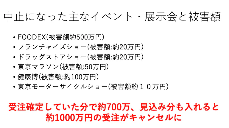 これにより、3月に予定していたほぼすべての展示会が中止されました(売上9割減の壊滅的な状態)。また、3月10日には政府からイベント自粛の要請の延長が発表され、再開の見込みも立たず、4月の展示会も続々とキャンセルの連絡が届いています。私も断腸の想いで、キャストたちへの依頼をキャンセルせざるをえませんでした。