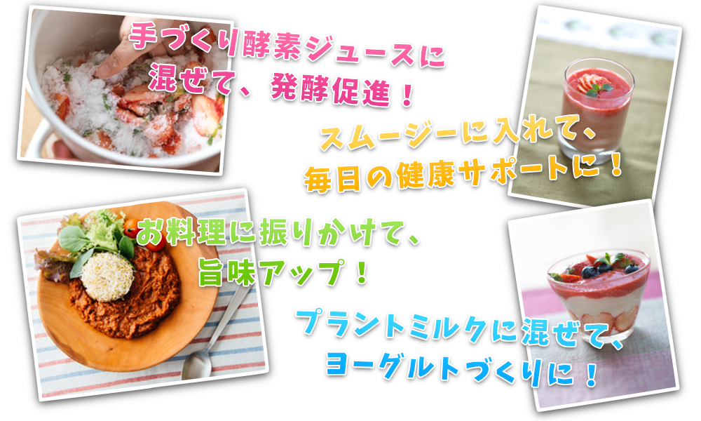 ・ナッツチーズ、豆乳ヨーグルト、ココナッツヨーグルト、漬物など様々な発酵食品を作る際に発酵助成剤としても使用頂けます。