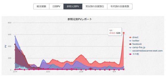 2017/04/07 21:56CAMPFIREには、プロジェクトオーナーの管理画面にいろんな機能があるのですが。 「インサイト」という、いわゆる動向を数値・グラフで見られる部分をなんとなく眺めていましたら。 …昨日(4月6日)に、TwitterやFacebook、CAMPFIREサイト内から以外のアクセスがぴょ~ん!と伸びていまして。 この、日本初の「アルビノ」コンセプトBar/Cafeを、東京・中野に爆誕させたい!プロジェクト開始当日・直後は、一気にSNSなどの告知協力もあり大拡散して、3日くらいで沈静化…。 その後、継続的なTwitterでのアクセスが平均的にあります。(RT拡散協力してくれてるみんな、見てくださってる皆さん、ありがとうございます!) 全体的に、僕の関係界隈は、やはりFacebookよりもTwitterの方が圧倒的に動いているんだなあ…なんて、その推移は継続的に見ていたのですが。(そもそも僕がFacebookよりTwitterの方をひいきしているのですが) 昨日の“direct”のアクセスは、CAMPFIREサイトに掲載された効果ではなく、AbemaTVに映ったタイミングとも違い、Twitterの告知も反応が薄れてきている中…、それらのどれでもない“何か”の反応のようで、あははははっ、ふしぎ~。 仕掛けたことと言えば、僕が自分のブログKASUYA.netに記事を書いたくらいしか、心当たりが無いのですが。 そもそもそのブログの方のアクセスが伸びた様子はないし…。 ちょっとした怪現象! 2chにでも晒されたのかな?どうかな? 何か知っている人居たら、メッセージくださ~い。 もっと見る