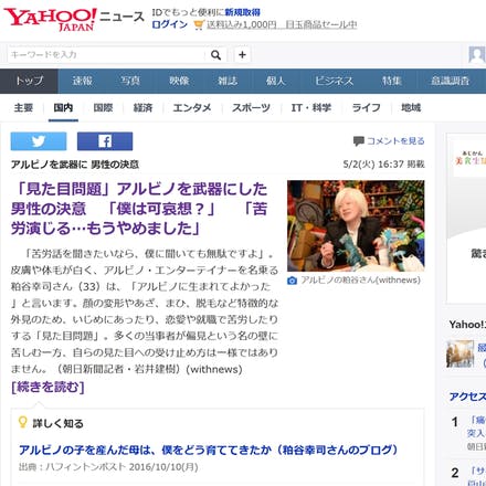 2017/05/02 19:07このクラウドファンディング企画をスタートして間もなく。 「なかなか面白いことやってますね」 そんな感じからいただいた今回のインタビュー取材。「見た目問題」のシリーズの中で(というかその界隈でも)かなり異色な僕のメッセージを、かなりストレートに記事にしていただけて嬉しいです! 「見た目問題」アルビノを武器にした男性の決意 「僕は可哀想?」 – withnews(ウィズニュース) 元記事がコレで、画像もリンクも満載です。 そしてこれが、ライブドアニュースにもYahoo!ニュースにも、各ニュースメディアに配信されてから、とてもたくさんの反応をいただけて嬉しみです。 なにより、前回のAbemaTV「AbemaPrime」のインタビュー映像出演のときには惜しくも構成・時間の都合上カットになってしまったこのクラウドファンディング企画についても、リンク付きでがっちり記載してくれたことがイイ!ですよね。 すごく良かったので自分のブログも書きまして。(withnews(ウィズニュース)にアルビノの日本人の僕のインタビュー記事がっつり載りました) Twitterでの反応も良く、またニュース記事を見て「粕谷が載ってるじゃん!」って友だちから連絡も来ました。 本当に本当に嬉しいです! のこり1週間。ゴールデンウィークを挟んでいるので、じっくり考えたり知ったりしてもらって。そして週明けにどんな展開になるか、心待ちにしていきます! 参考: 「見た目問題」解決NPO法人マイフェイス・マイスタイル 僕のTwitter 粕谷幸司▶アルビノBar/Cafeの人(@96mouse) もっと見る