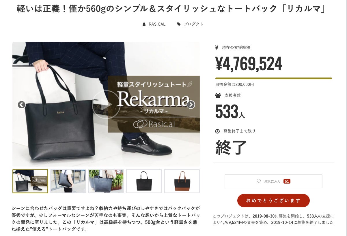 ラシカルでは、これまでバックパックや財布をメインに開発し、おかげさまで6,000名以上の皆様から合計7000万円以上のご支援をいただいております。また合わせて皆様からたくさんのフィードバックもいただいております。