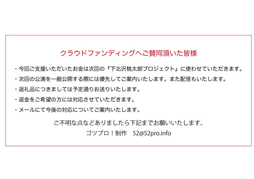 目標金額に満たない場合も、計画を実行し、リターンをお届けします。余剰金が発生した場合はこのプロジェクトの今後の活動の運営資金にさせていただきます。詳細はゴツプロ!ホームページ等でご報告いたします。万が一国の指針や社会情勢により、このプロジェクトが中止となった場合は、今後の方針をホームページでお知らせし、出資者の方には個別にメールでご連絡いたします。返金をご希望の場合はご返金いたします。