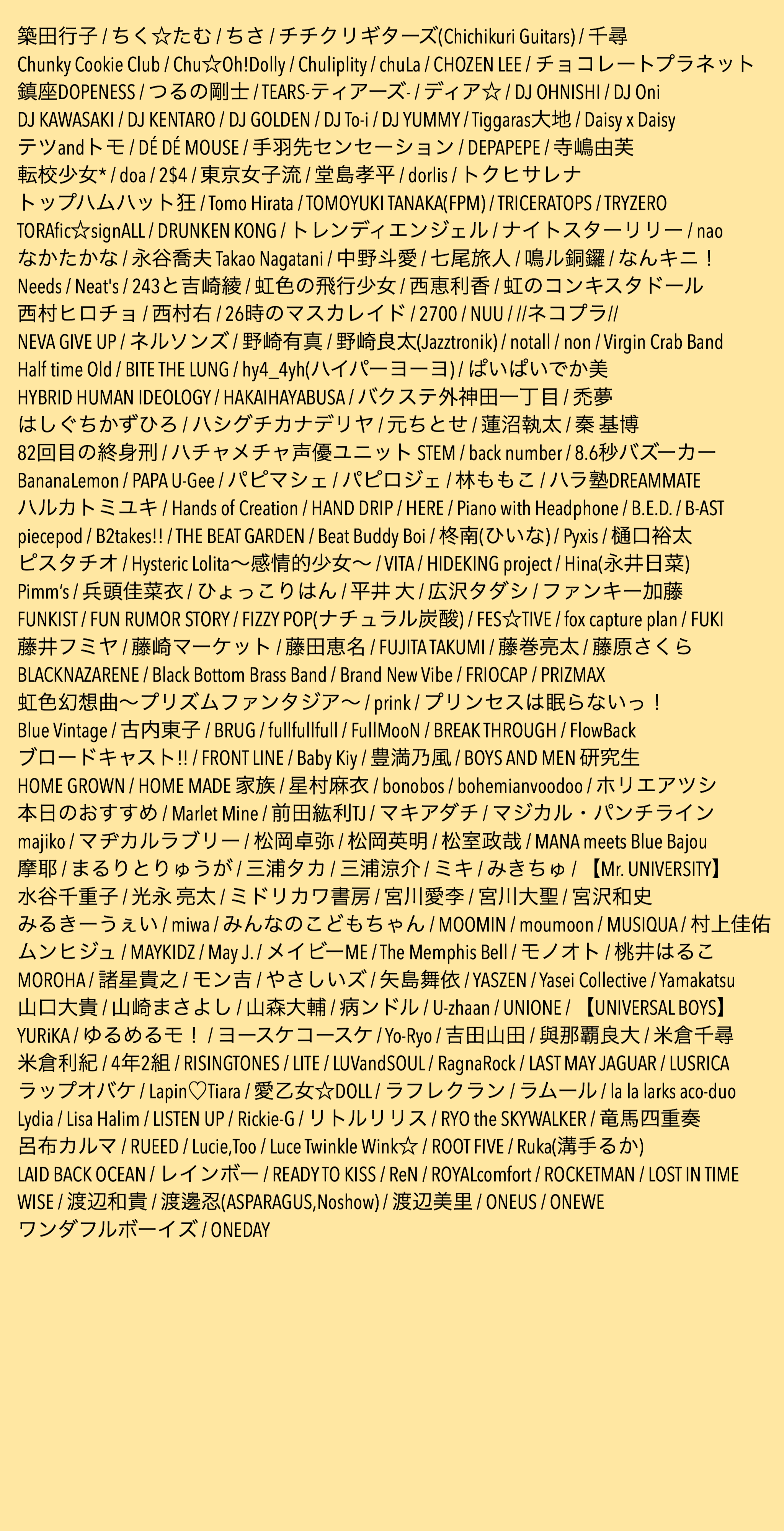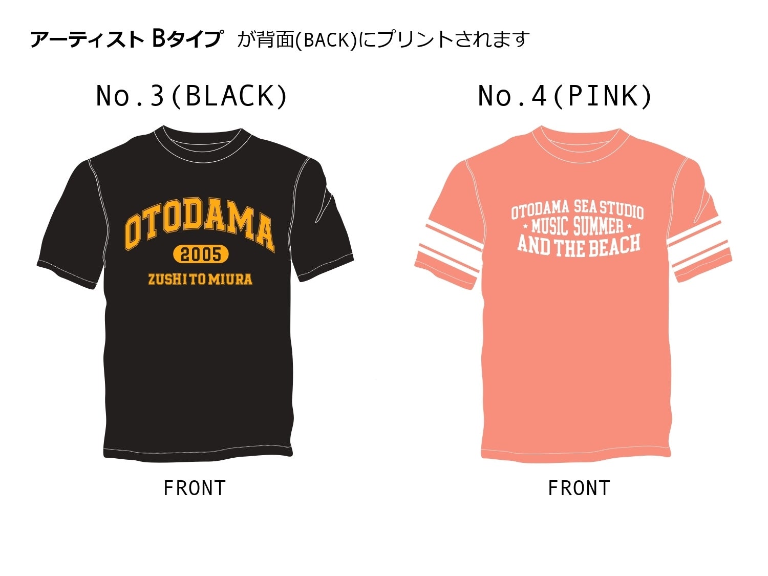 過去15年の間の出演者様から今回クラウドファンディングに賛同くださった515組のお名前を五十音順に掲載したTシャツ4種類(アーティストAタイプ2種類、アーティストBタイプ2種類)と、2005年〜2020年の開催日程を掲載した1種類の計5種類を製作し、今回のクラウドファンディングのリターン品とさせていただきます。