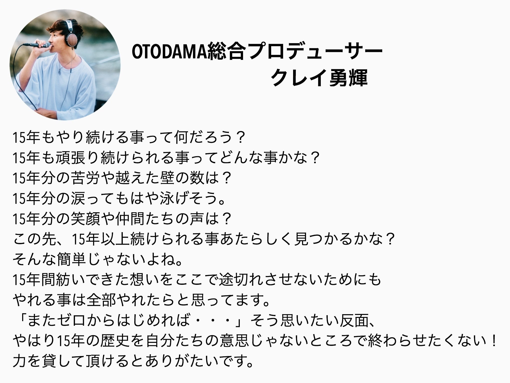 15年という節目を迎えたOTODAMAは多くのアーティスト様、お客様、スタッフと紡いできたもの。全公演が中止となった今年ですが、 ”どんなカタチでもOTODAMAを残したい" 気持ちから『15年を振り返るTシャツ』を製作することに決め、過去の出演アーティストにご協力のお声かけをさせていただきました。