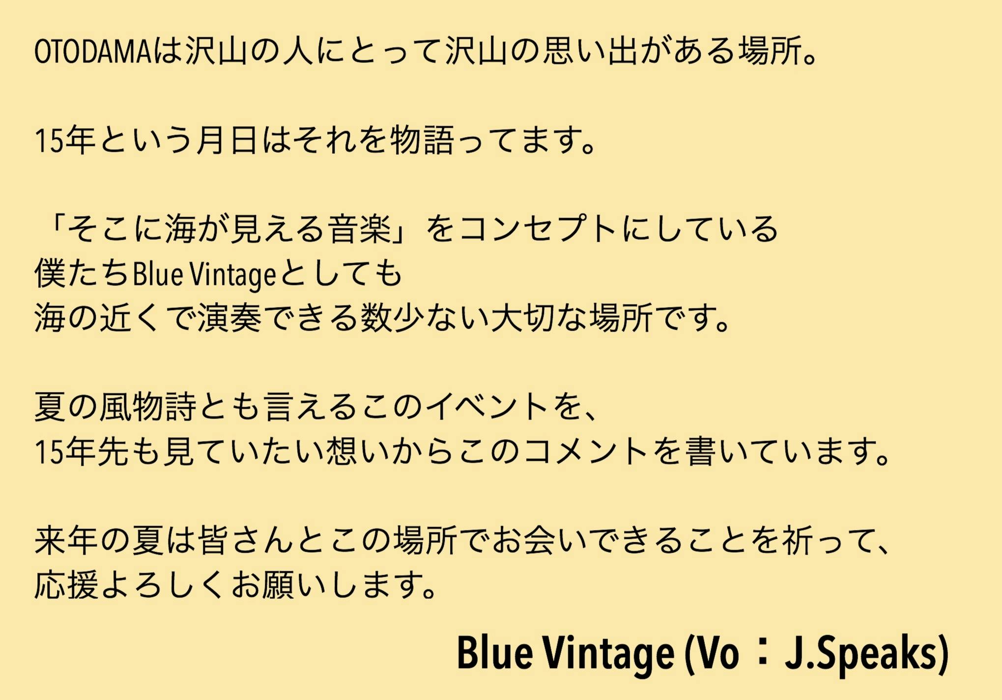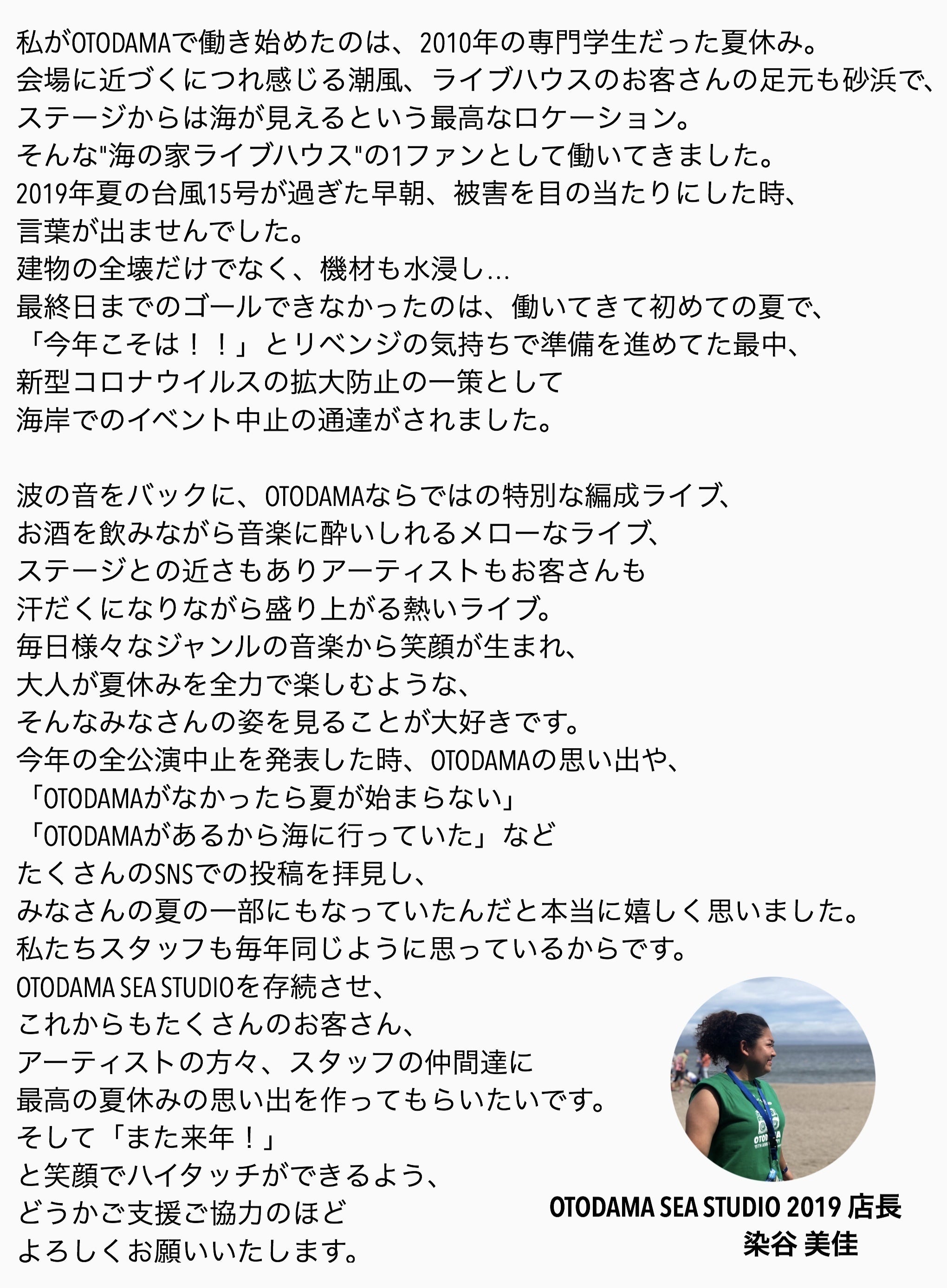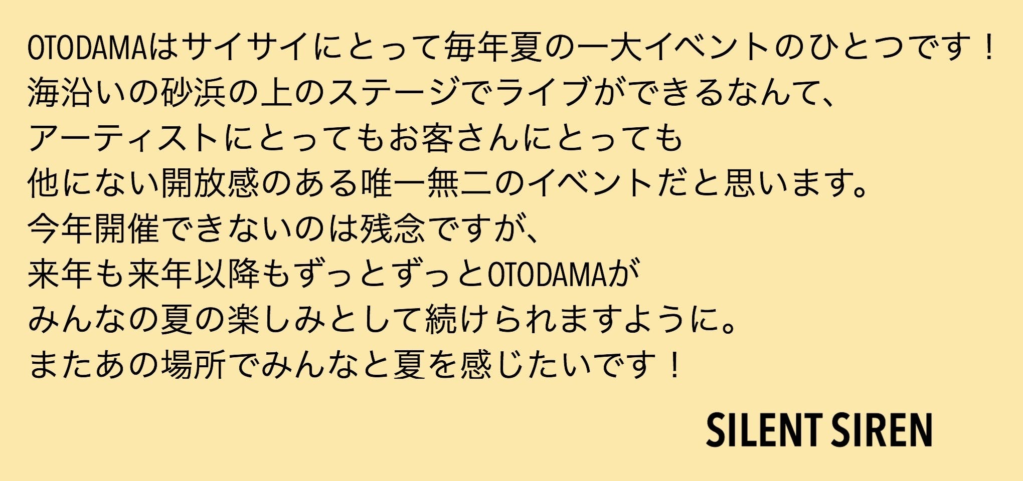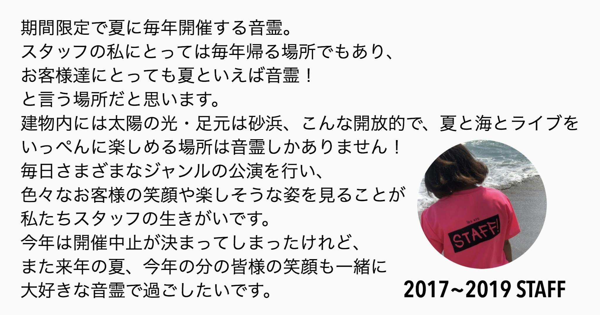 2021/04/30 12:30こんにちは。OTODAMA運営事務局からお知らせです。昨年から続く新型コロナウイルス感染症の影響によるイベント開催に関する制限、さらに海水浴場の運営ガイドラインも未だ不明なため、今年2021年の『OTODAMA SEA STUDIO』は開催を見送ることといたしました。昨年、このCAMPFIREを通じてOTODAMAを応援いただいた皆様、本当に申し訳ありません。来年の開催に向け引き続き前向きに準備を進めてまいります。なお、昨年の応援のリターンとなっている「会場内にお名前を記載」の権利については来年の開催時に引き継がせていただきます。コロナ感染症が終息し、ライブを思う存分楽しめる日が一日も早く来ることを願っています。 もっと見る