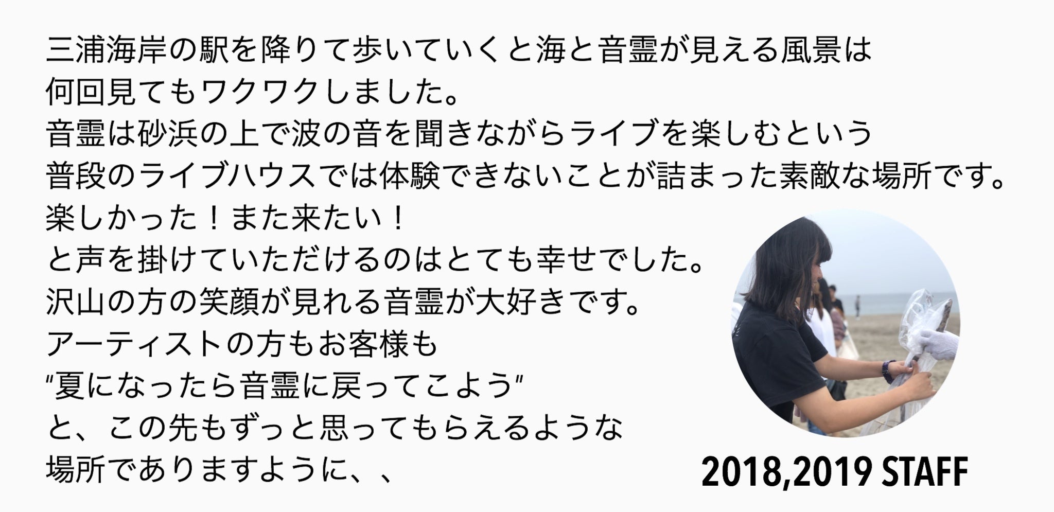 2005年に逗子海岸でスタートした『OTODAMA SEA STUDIO』 は浜辺に夏期限定で建つ海の家ライブハウスです。毎年、アーティスト様や芸人などジャンルレスの多くの方々400組以上に出演いただき、昨年は三浦海岸で15周年を迎えることができました。
