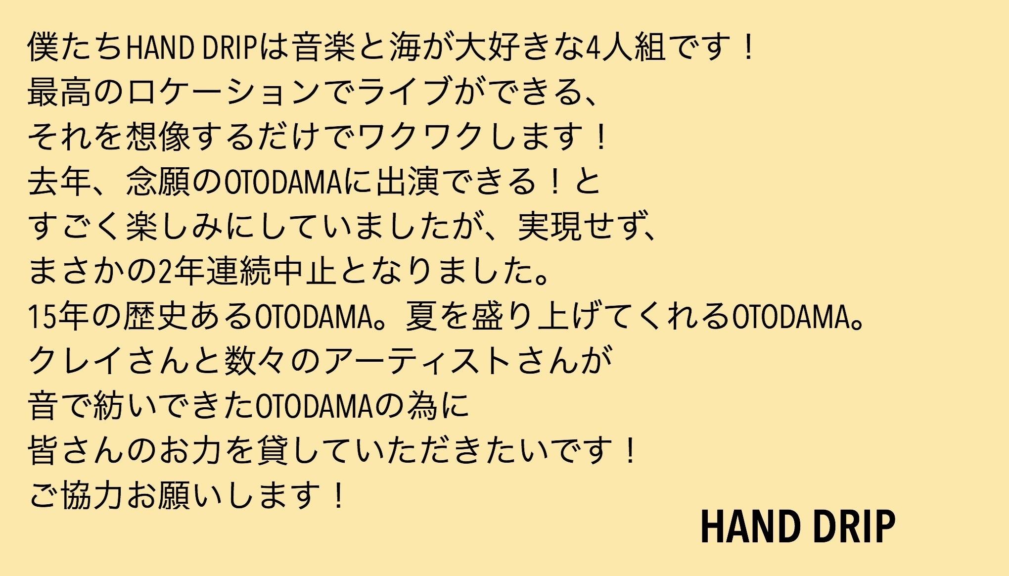 何とかOTODAMAを来年以後も継続できるよう、これまでOTODAMAに来ていただいた皆様、今年も行こうと思ってくれていただいた皆様、今回のクラウドファンディングで初めてOTODAMAを知っていただいた皆様、何卒ご協力のほど宜しくお願いいたします。