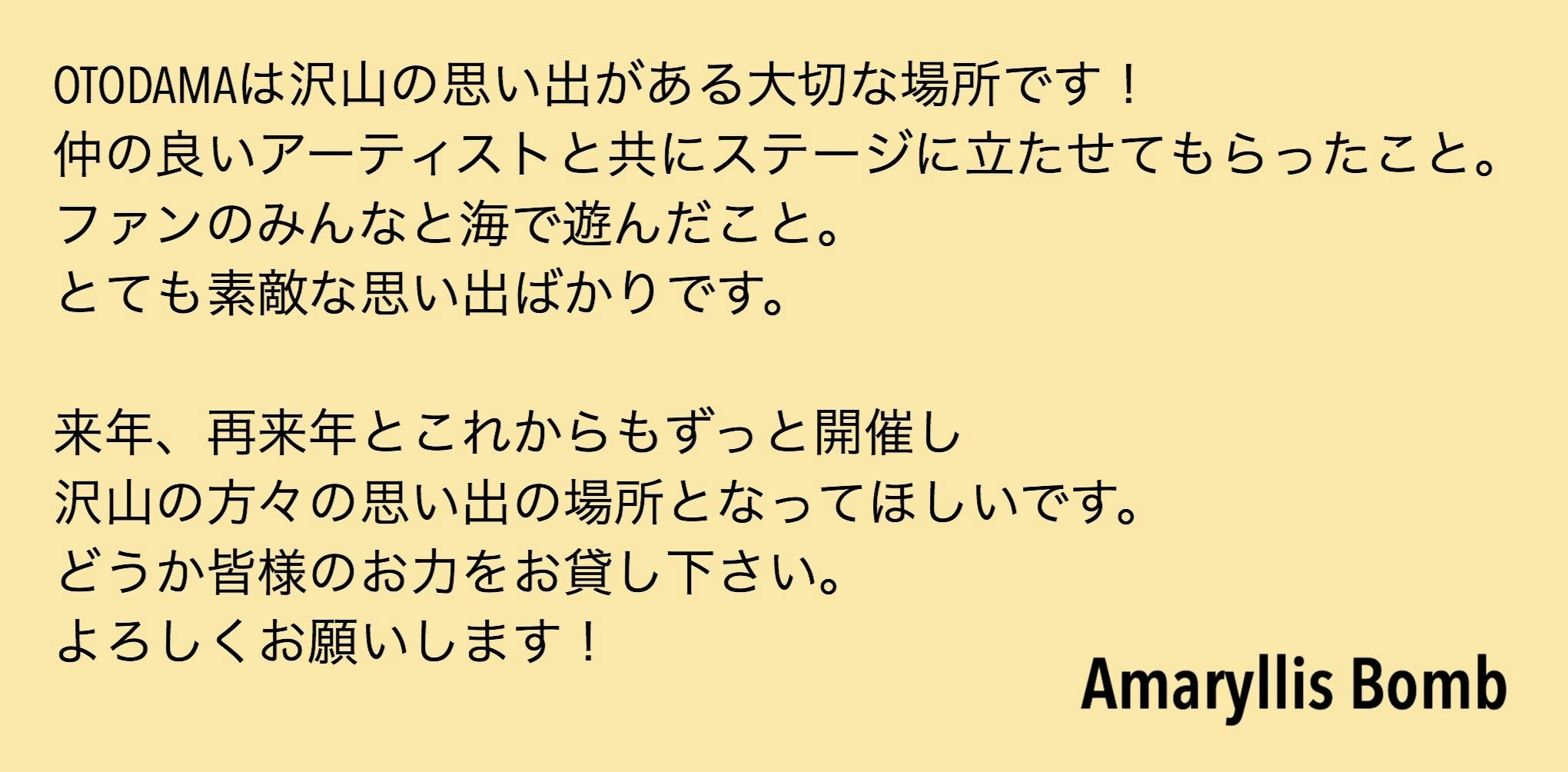皆様には支援を募るかたちになってしまうのが心苦しい限りですが、クラウドファンディングを立ち上げ、今年のOTODAMAの売上補填と来年以降のOTODAMA開催準備費とし支援の一部を使用させていただきたいと思います。