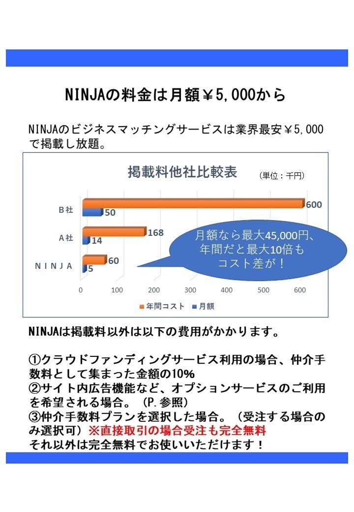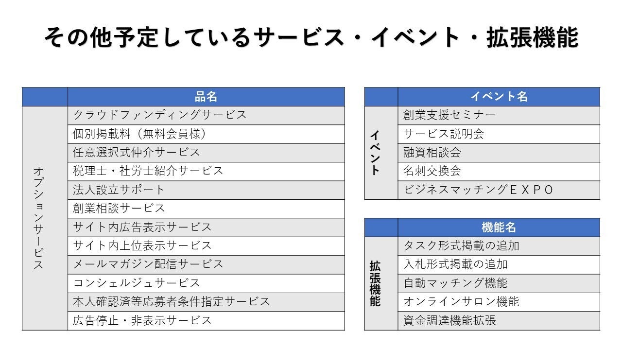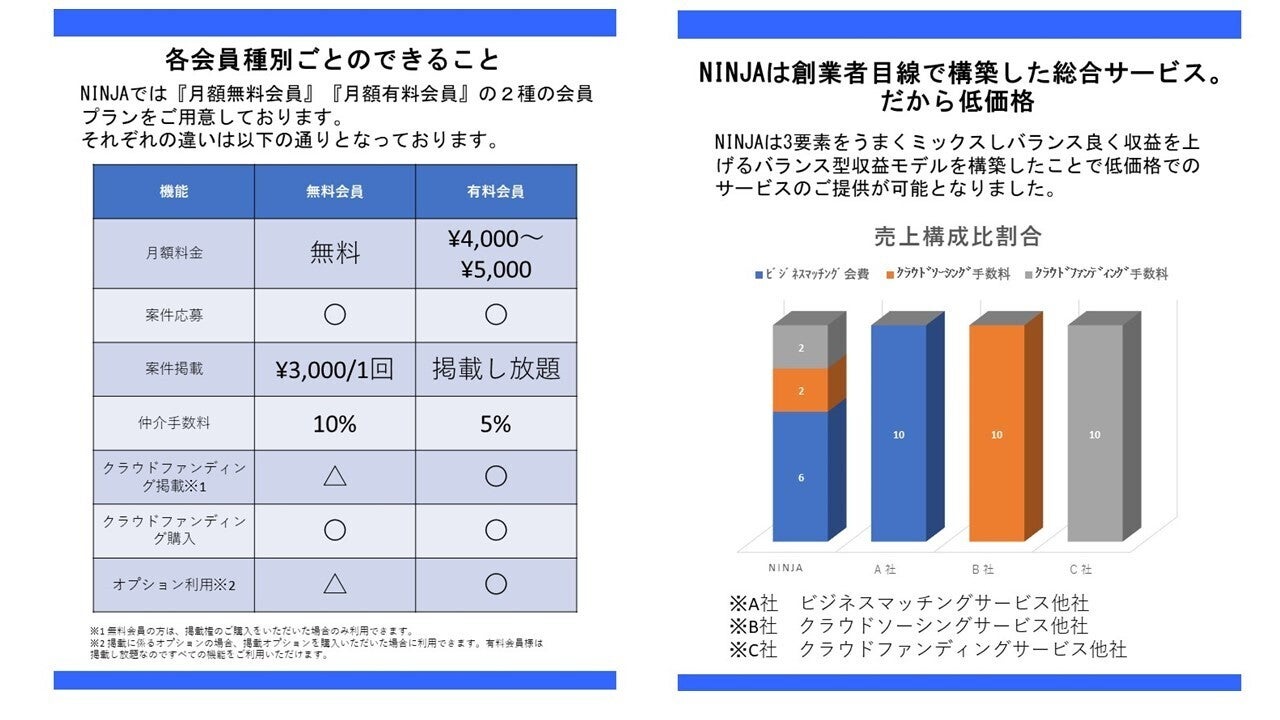 ② 大別して『ビジネスマッチング』『クラウドソーシング』『クラウドファンディング』の3要素を搭載しビジネスマッチングサービスをベースとしたバランス良く収益を上げるビジネスモデルの為、それぞれの要素について業界最安値での提供を実現。