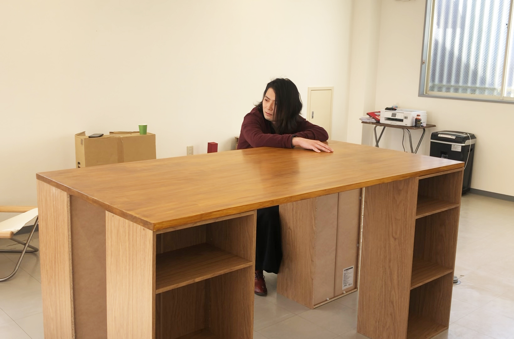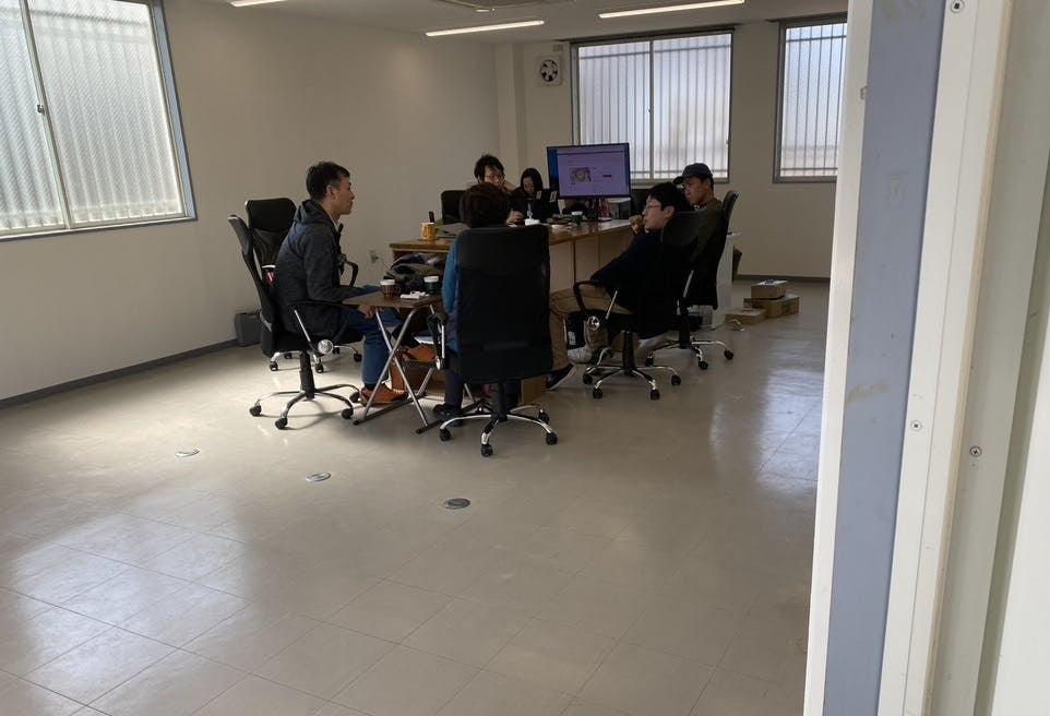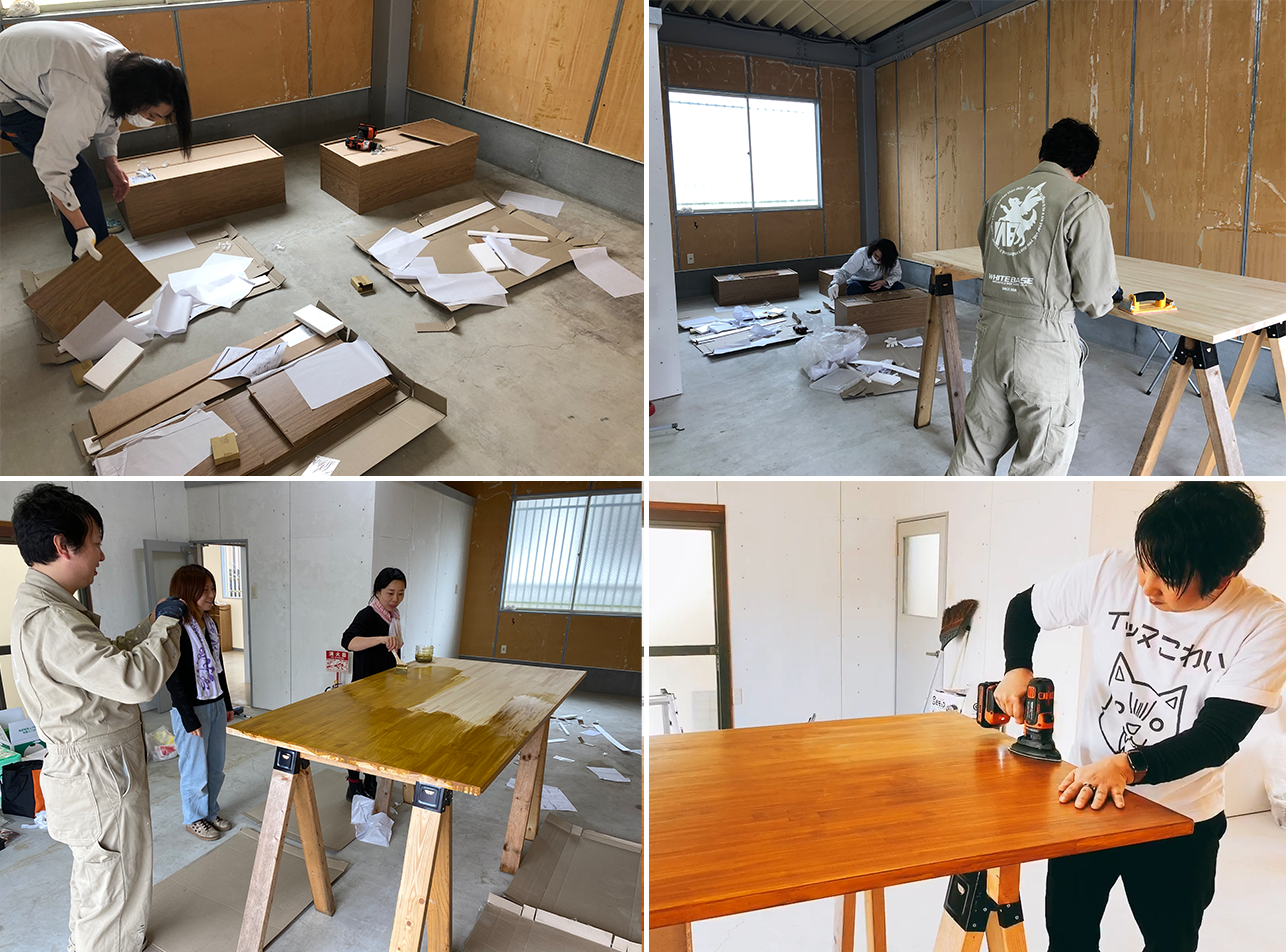 スタッフ全員分の備品を揃える資金もないので、とりあえず今は各自に必要なものを持ち寄ってもらって作業してもらっています。机を全員分購入できないので、みんなで使える大きな机をDIYでしました。少し背が高すぎましたが、とても気に入っています。