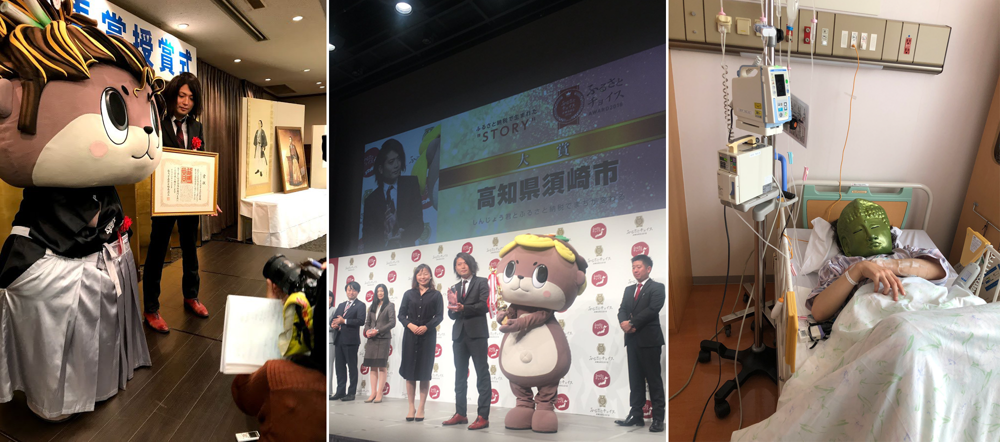 私がアテンドを務めたしんじょう君というご当地キャラクターは、全国のみなさまの応援のおかげで『ゆるキャラグランプリ2016』で第1位を獲得することができました。加えて、担当するふるさと納税業務では前年度の200万円から1年で5億円へと大きく寄付額を伸ばすことができました。また、高知県内でその年一番活躍したの個人や団体に送られる「龍馬賞」を受賞し、ふるさと納税でユニークな取り組みをした自治体に送られる「ふるさとチョイスアワード」でグランプリを受賞し、昨年は急性膵炎で入院しましたありがとうございます!