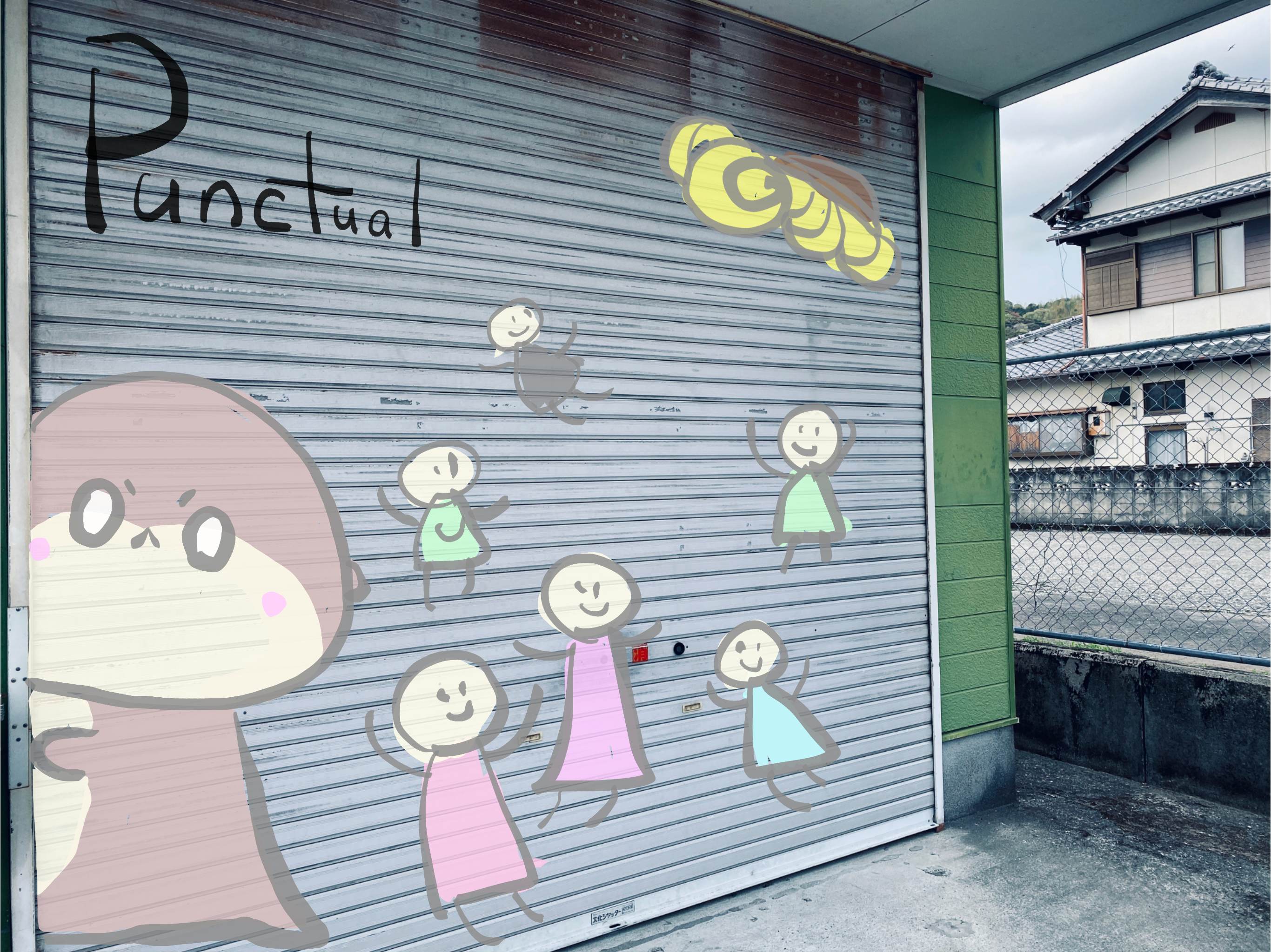こんな感じのイラストを描きたいと思います。皆様と一緒に作ってきたしんじょう君ですが、この会社も同じで「皆様と一緒に作っていく」という理念のもと、リターンで「シャッターにイラストで参加」を選んでご支援を頂いた方のイラストをここに描かせて頂きます。