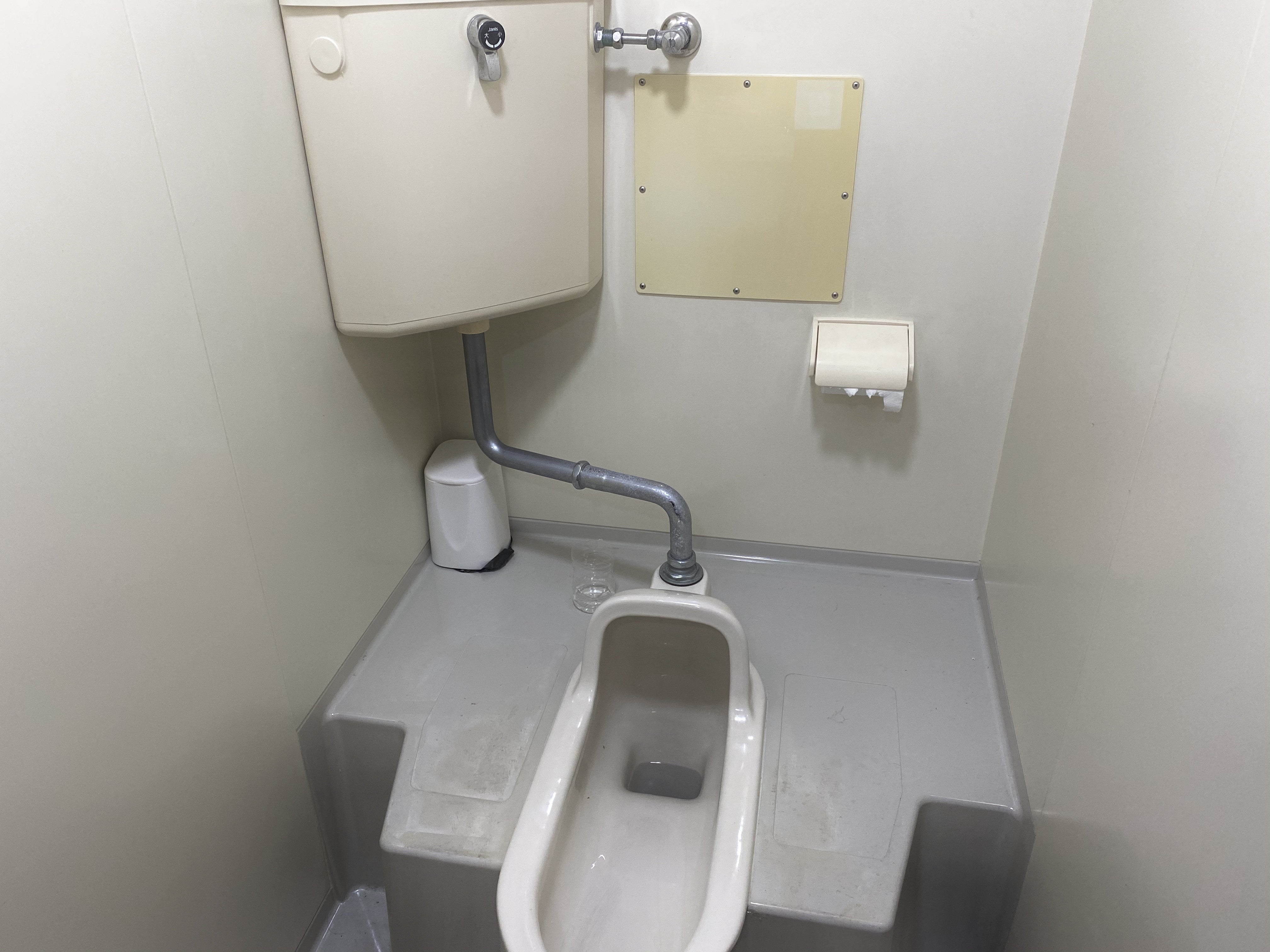 スタッフが利用するには問題ありませんが、遠方からいらっしゃるお友達のご当地キャラさんやスタッフさん、大切なお客様にこのお手洗いを使っていただくのは心苦しいです。また、狭いうえに段差があるので、お年寄りの方や体の不自由な方が使うにも不便です。