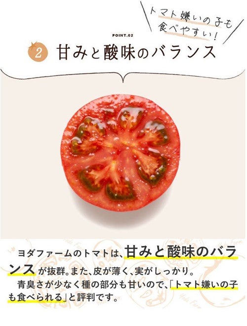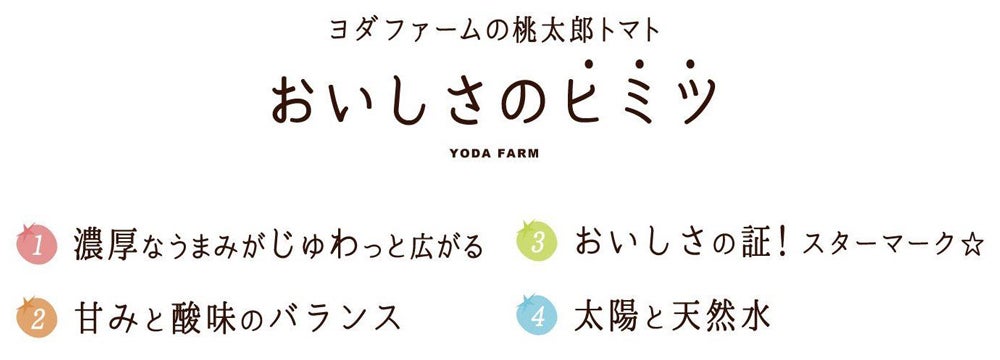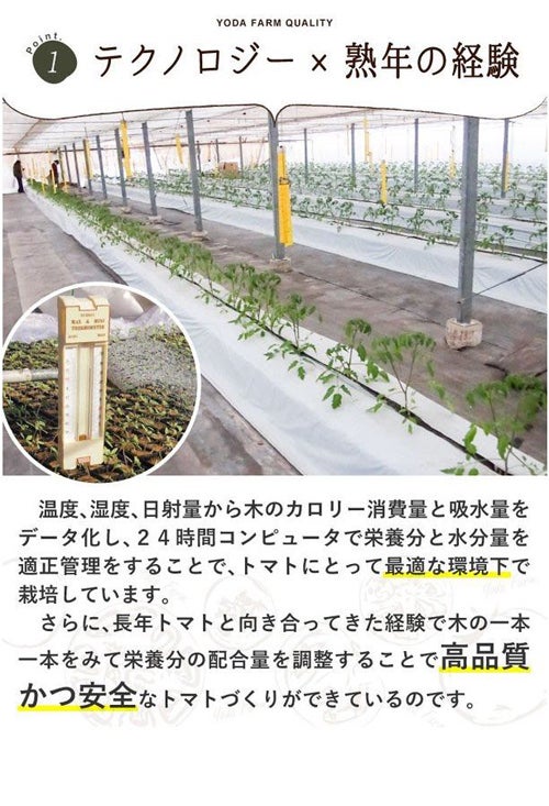 低農薬・たっぷり太陽と天然水の恵みを浴びて、熟年の経験に加え、テクノロジー(24時間コンピュータで栄養分・水分を徹底管理)を駆使し、「過保護」に育てられたヨダファームさん自慢のトマト。