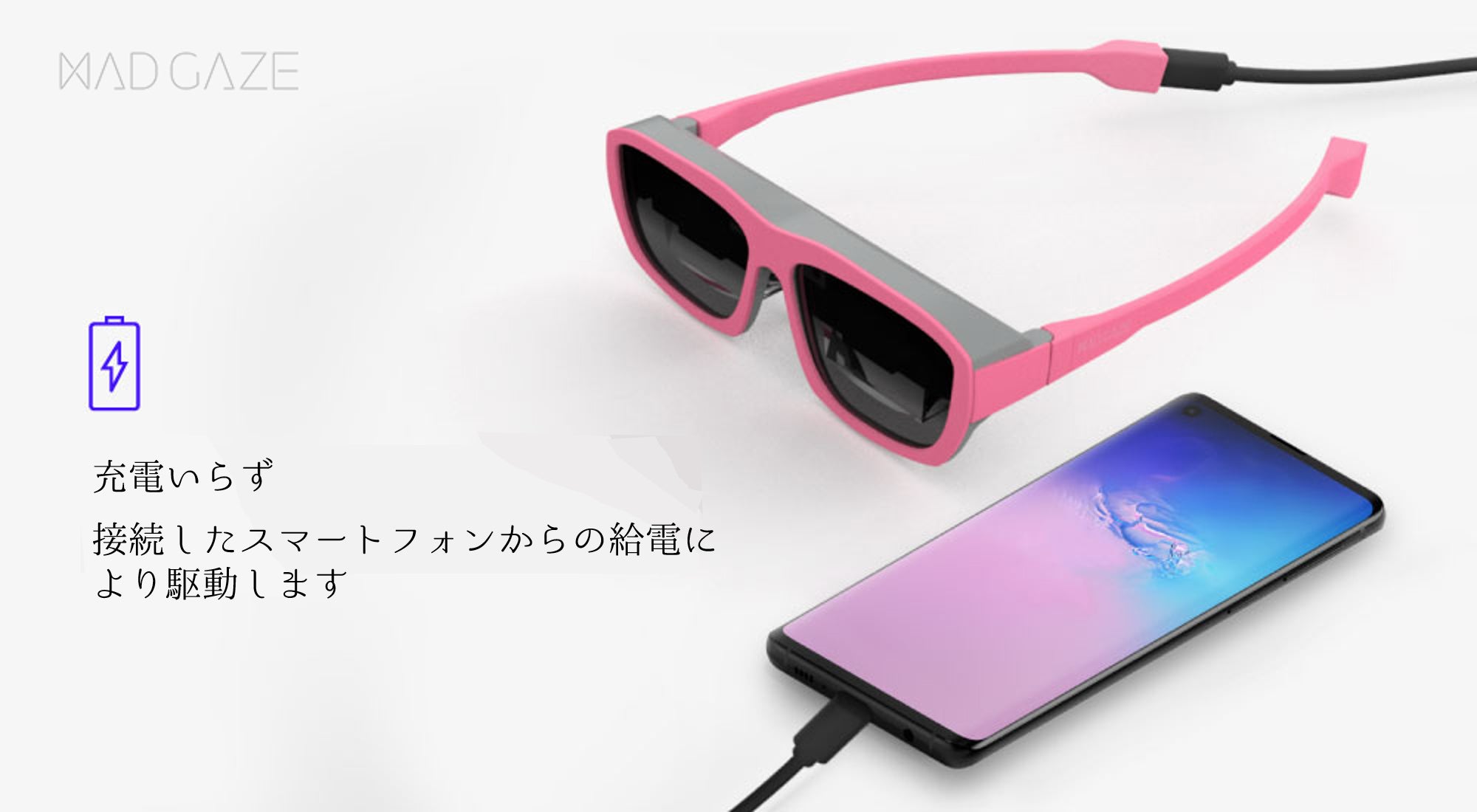 最新のMRスマートグラスである「GLOW」はタブレットやノートパソコンに変わるアイテムとして設計されています。「GLOW」をUSB-Cポート経由でスマートフォン等に接続するだけで、簡単に使用することができます。