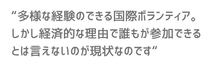 このように国際ボランティアは、非常に得るものが多い活動です。しかし、アレンジメント費や交通費などが必要で、経済的に余裕のない方は参加できず、その人自身の多様な経験や人生の可能性を狭めてしまうと思います。